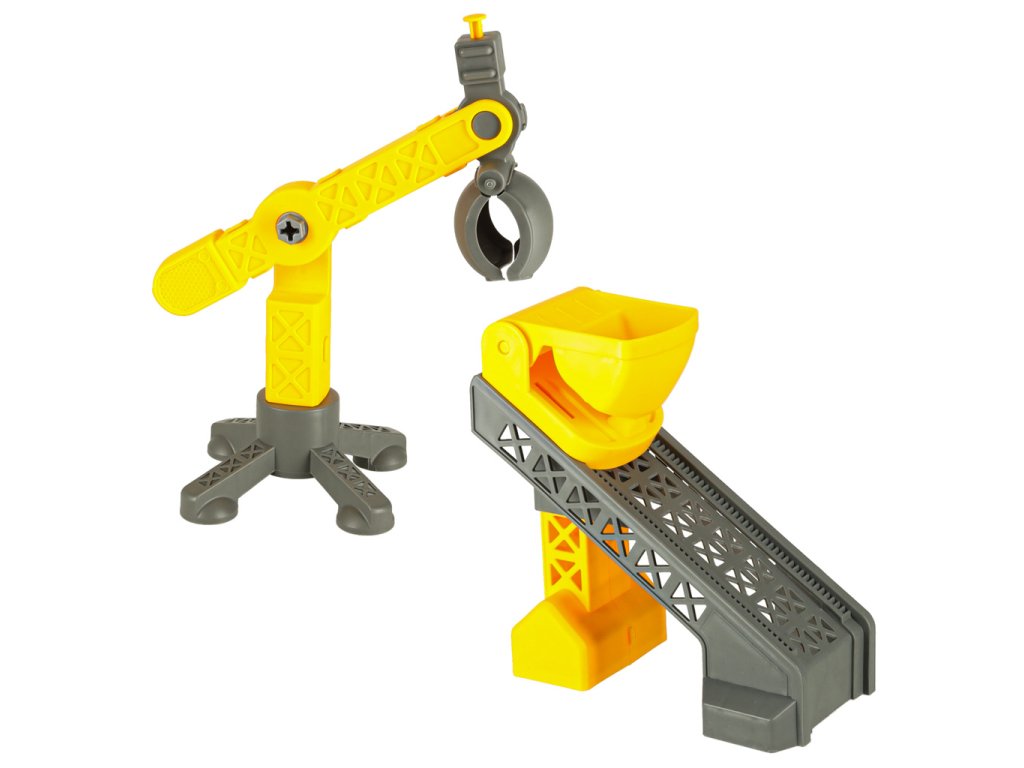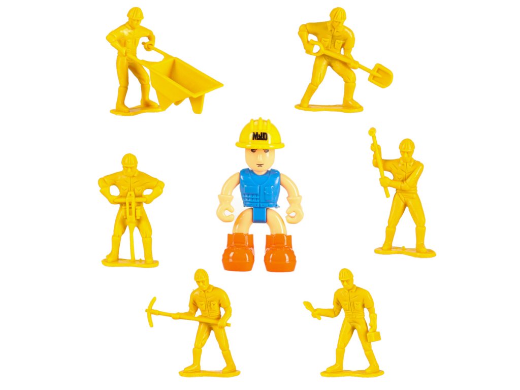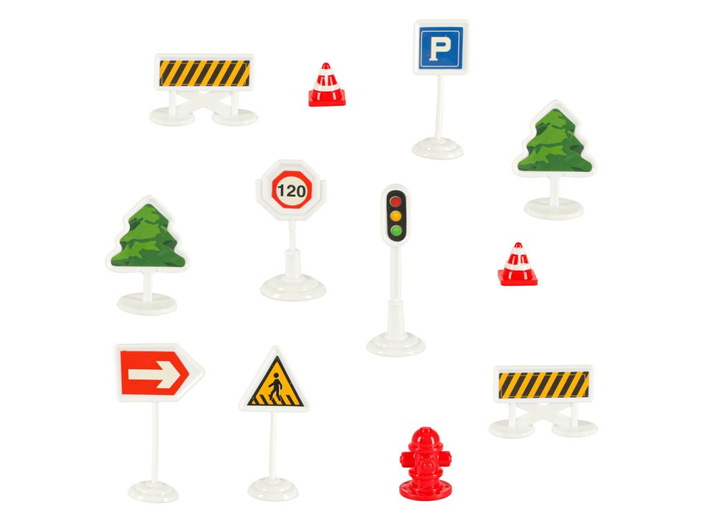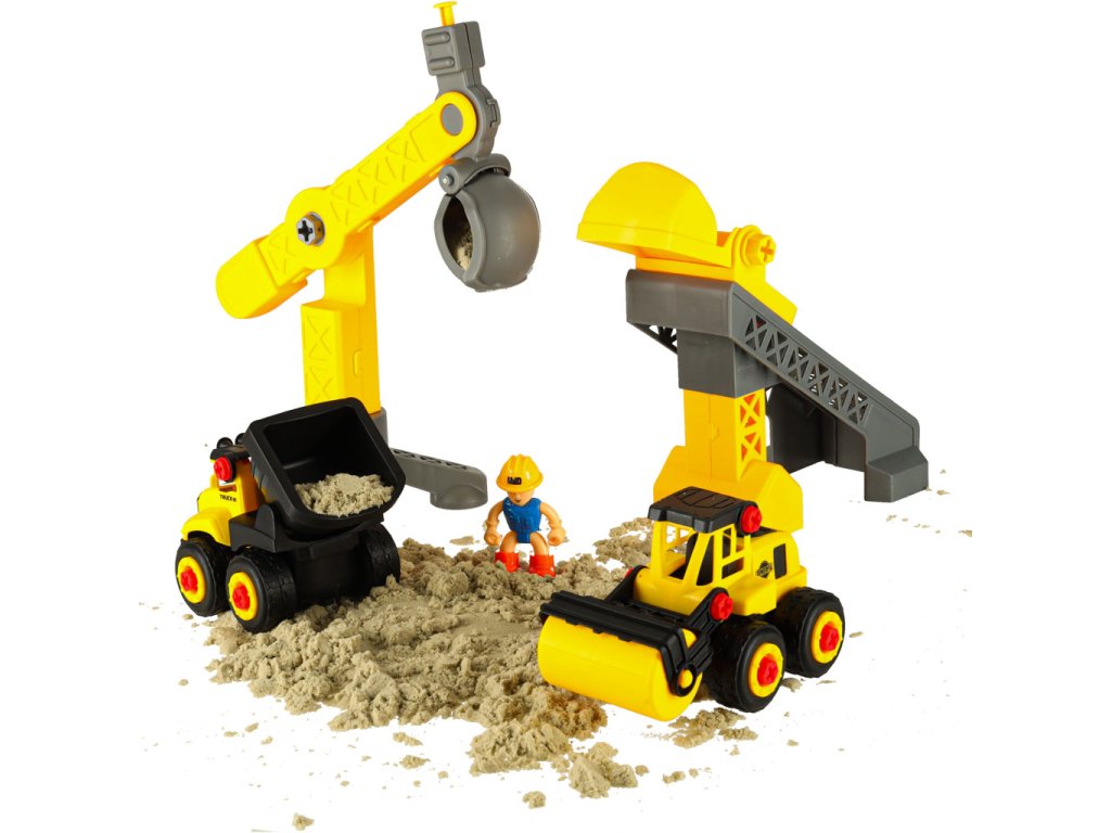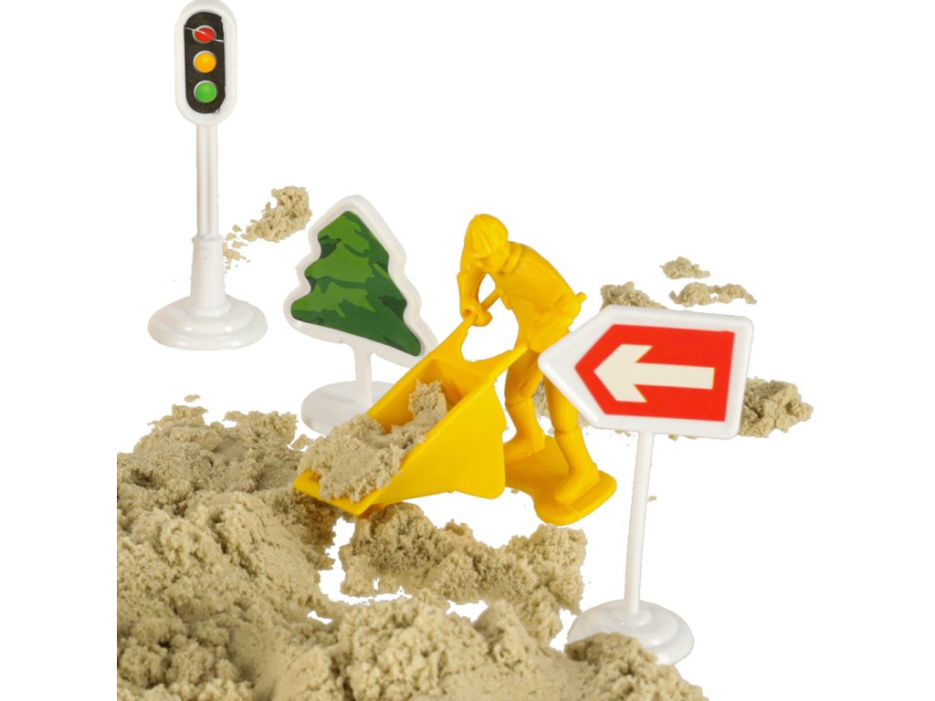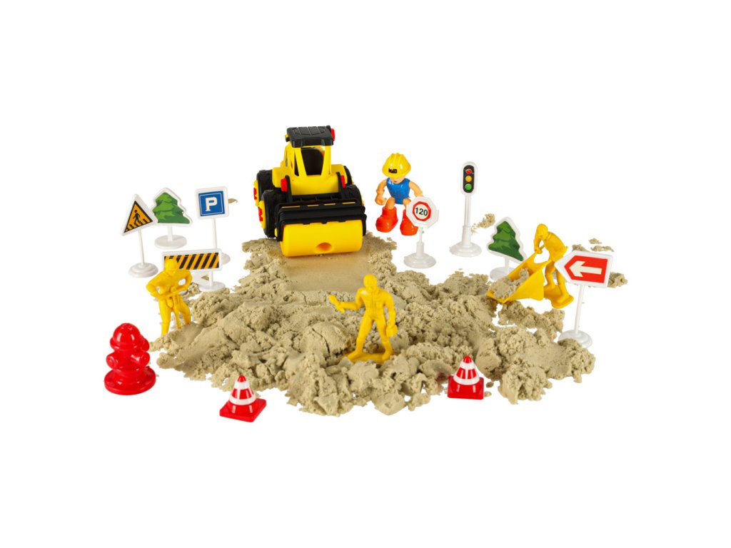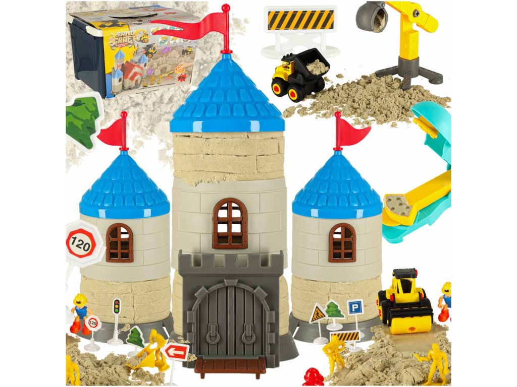 - Písek 1100 g- hradní prvky (základy, věže, dveře a okna, střecha, vlajky)- výrobník pískových cihel- nářadí na písek (lopata a kleště)- třídička písku- návod k použití- 6x formičky- 2x šroubovák na hračky- 1 x figurka člověka- sada dopravních značek + samolepky- 6x lidé (stavební dělníci) + trakař, lopata, kladivo- 1x hračka auto se sklápěčkou a - 1x hračka auto se silničním válcem (Sada obsahuje dvě auta s různými prvky. Provedení vozidel se může v jednotlivých sériích lišit)- Dopravníkový pás- Jeřáb s drapákem- Návod k použití