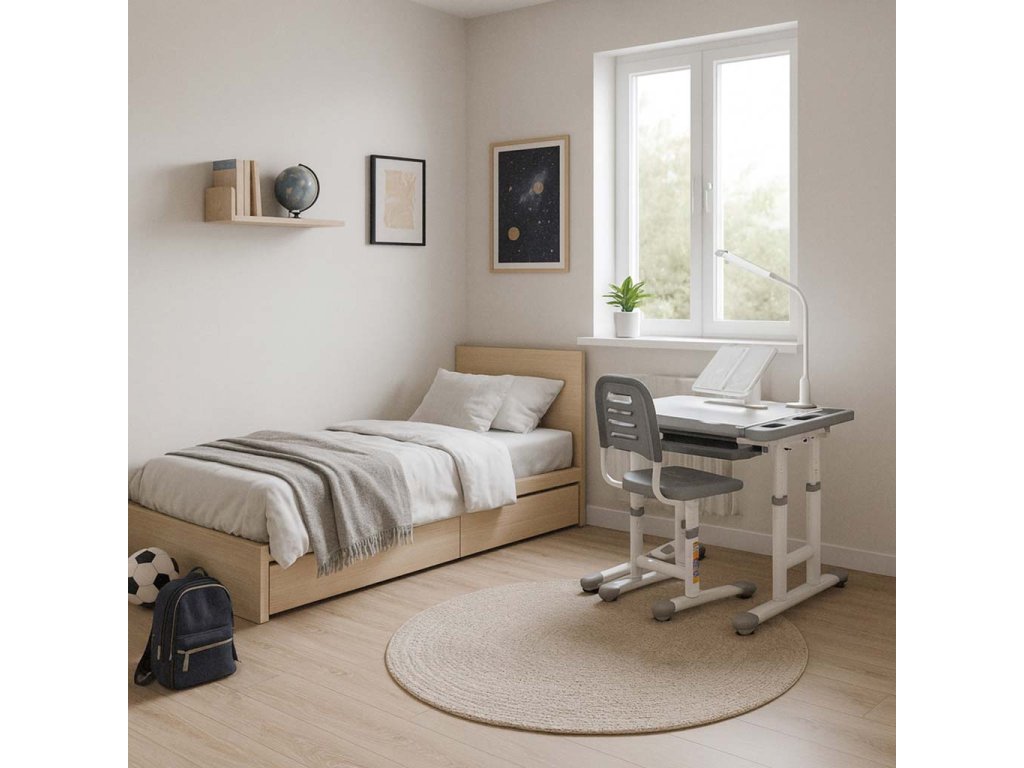- Klidné místo pro učení - Stůl s LED lampou a židle v dětském pokoji vytvářejí příjemný prostor, který usnadňuje soustředění na domácí úkoly nebo opakování učiva bez rušivých vlivů.