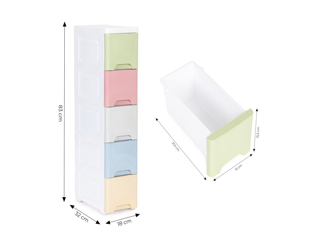 Regał składa się z pięciu kolorowych szuflad ze specjalnie wyprofilowanym uchwytem na froncie, co ułatwi Ci ich wsuwanie i wysuwanie.