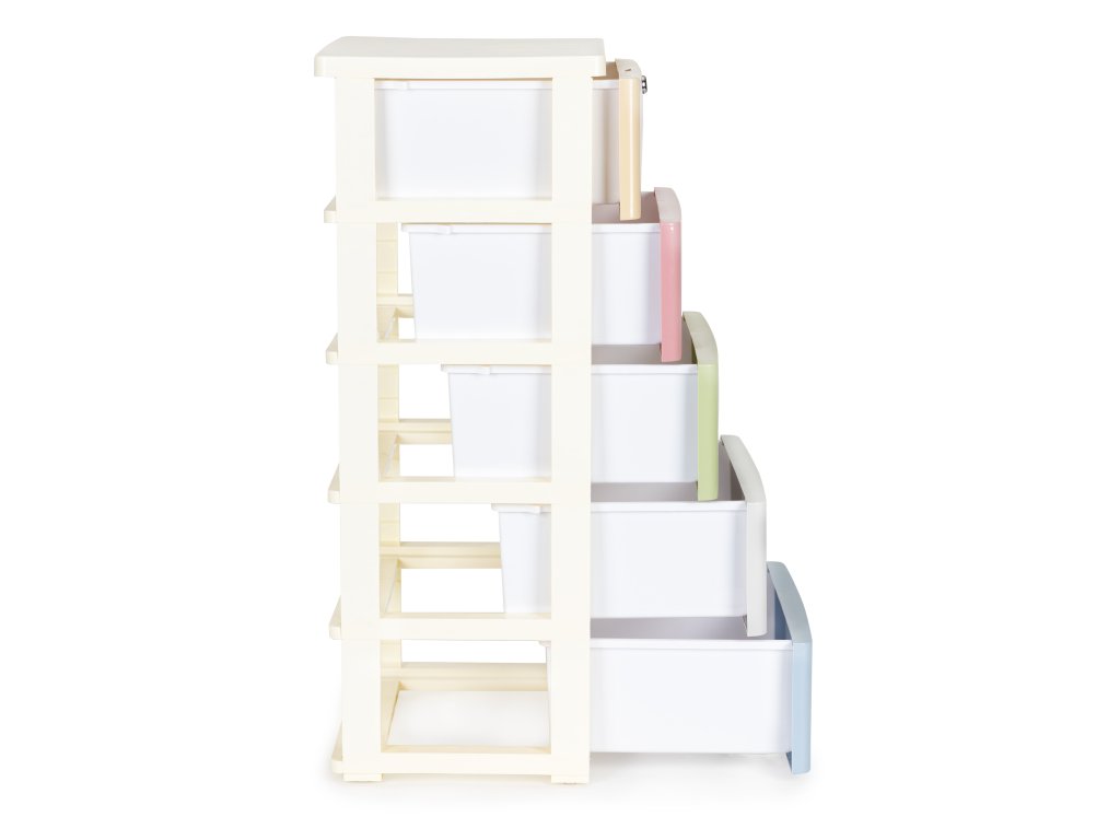 Regał składa się z pięciu kolorowych szuflad ze specjalnie wyprofilowanym uchwytem na froncie, co ułatwi Ci ich wsuwanie i wysuwanie.