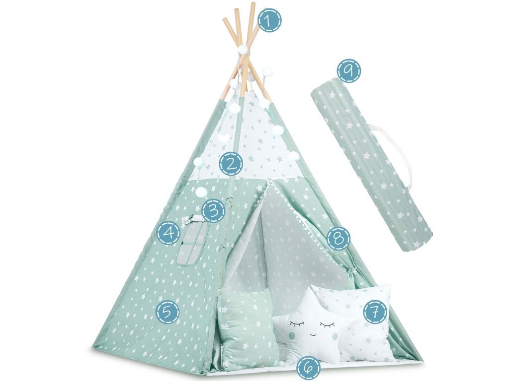 Aby bylo hraní ještě zábavnější, je týpí dodáváno s polštáře a izolační podložka s protiskluzovými výstupky.