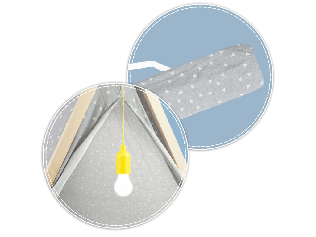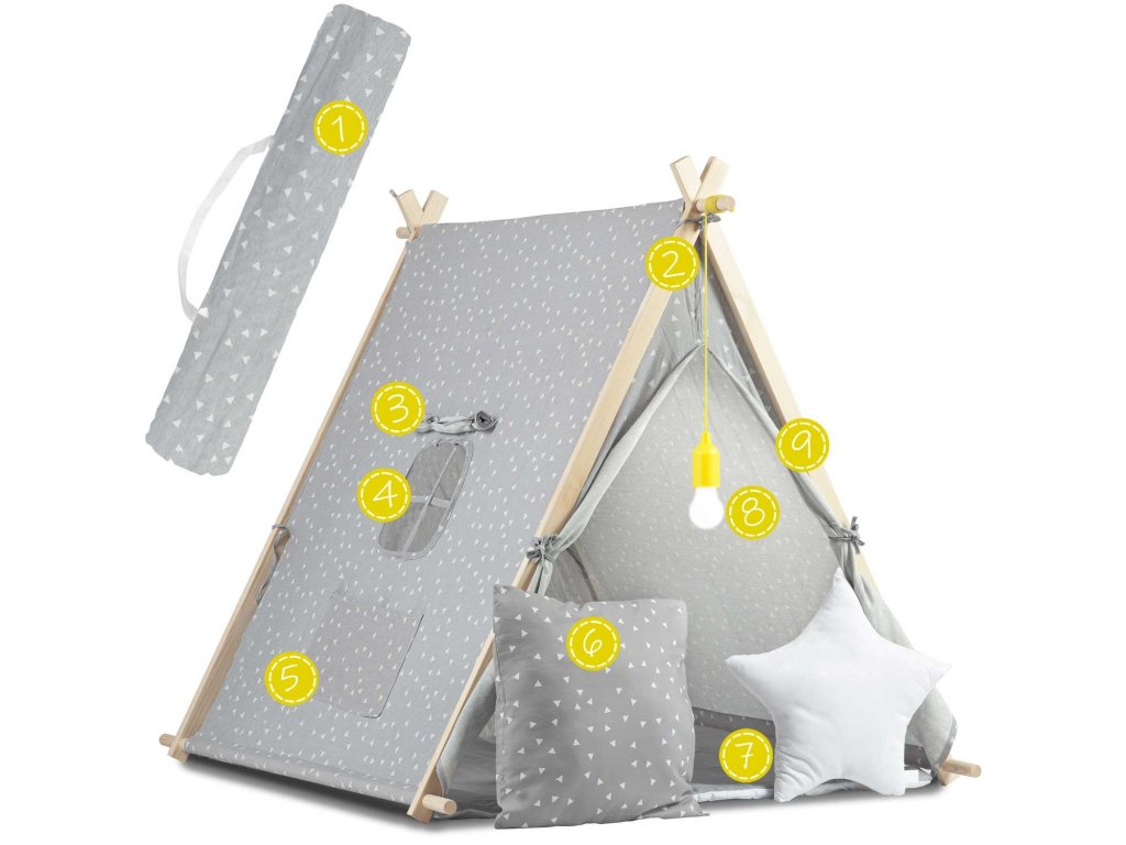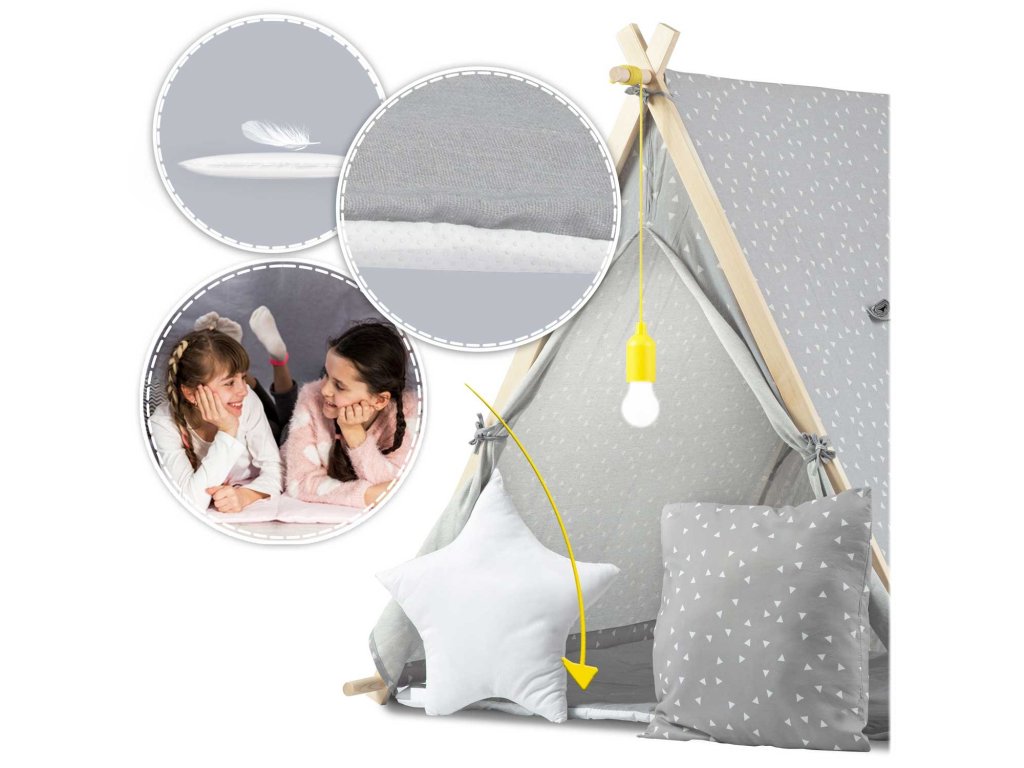 Aby bylo hraní ještě zábavnější, je týpí dodáváno s polštářky a izolační podložka s protiskluzovými výstupky.