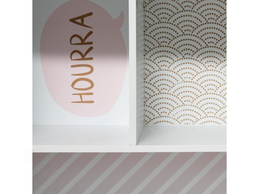 Tato domácí knihovna pro děti byla navržena v moderním duchu. Výběr tvaru a grafické vzory na pozadí dodávají romantický nádech, který se dětem jistě bude líbit. Tento kus nábytku má kovové šrouby pro snadnou montáž.