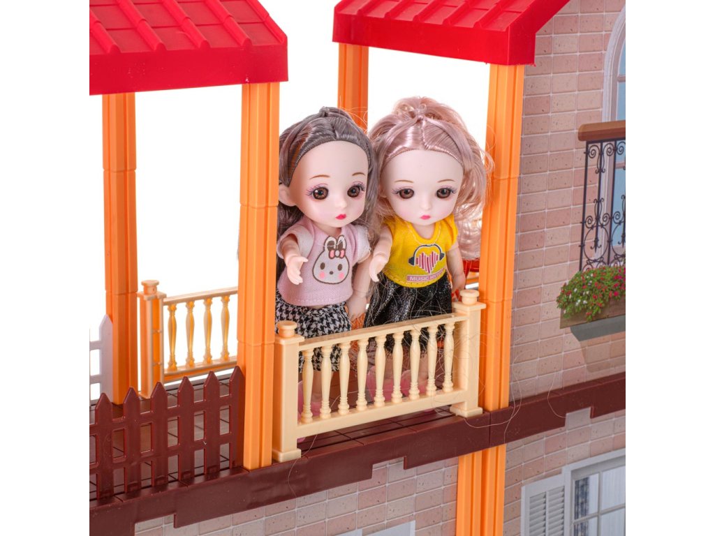 Domeček pro panenky willa červená střecha osvětlení + nábytek a panenky