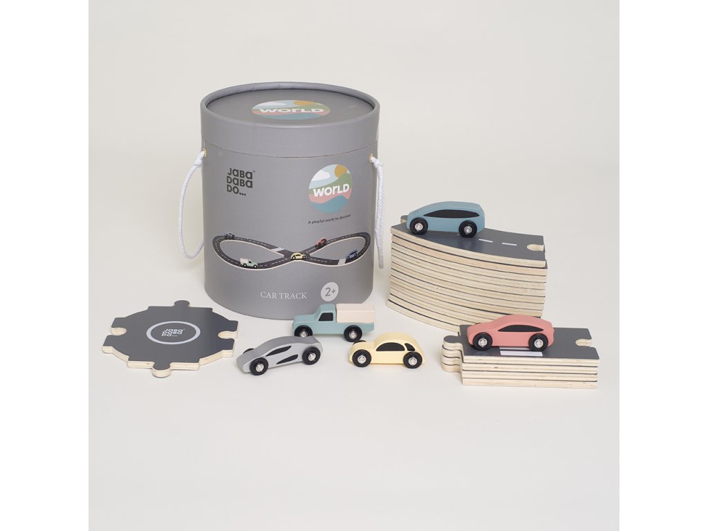 Tut tut tut, tady jsou auta! Dřevěná autodráha Jabadabado je ideální hračka pro všechny děti, které mají rády auta. Pět autíček je připraveno zrychlovat, aby se ukázalo, kdo bude na dráze první. Kdo je nejrychlejší? Dráha má na obou stranách koleje, takže ji můžete postavit různými způsoby, popusťte uzdu své kreativitě. Autodráhu lze postavit společně s garáží Jabadabado a dalšími výrobky s dráhami a je kompatibilní s dřevěnými dráhami většiny ostatních značek. Ideální velikost pro malé ručičky a při stavění a hraní s touto hračkou se trénuje dětská motorika. Podporuje kreativní hru.