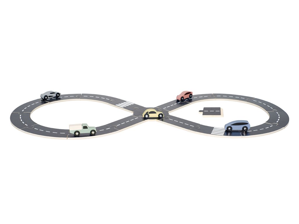 Obsahuje: 18 x kolejnice včetně jednoho speciálního dílu pro vjezd a výjezd z dráhy 5x autíčka