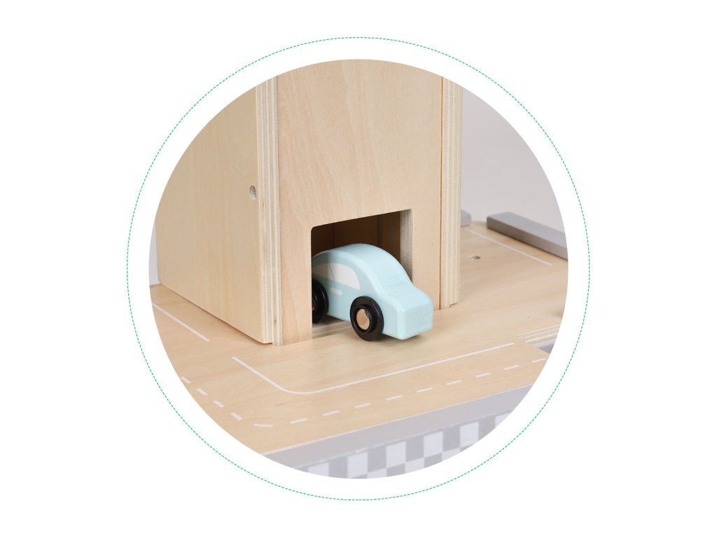Ve spodní úrovni se nachází pohyblivá bariéra, aby vaše dítě mohlo přímá přeprava . Má také k dispozici čerpací stanice umožnit malému řidiči doplnit palivo do jeho domácího vozového parku.