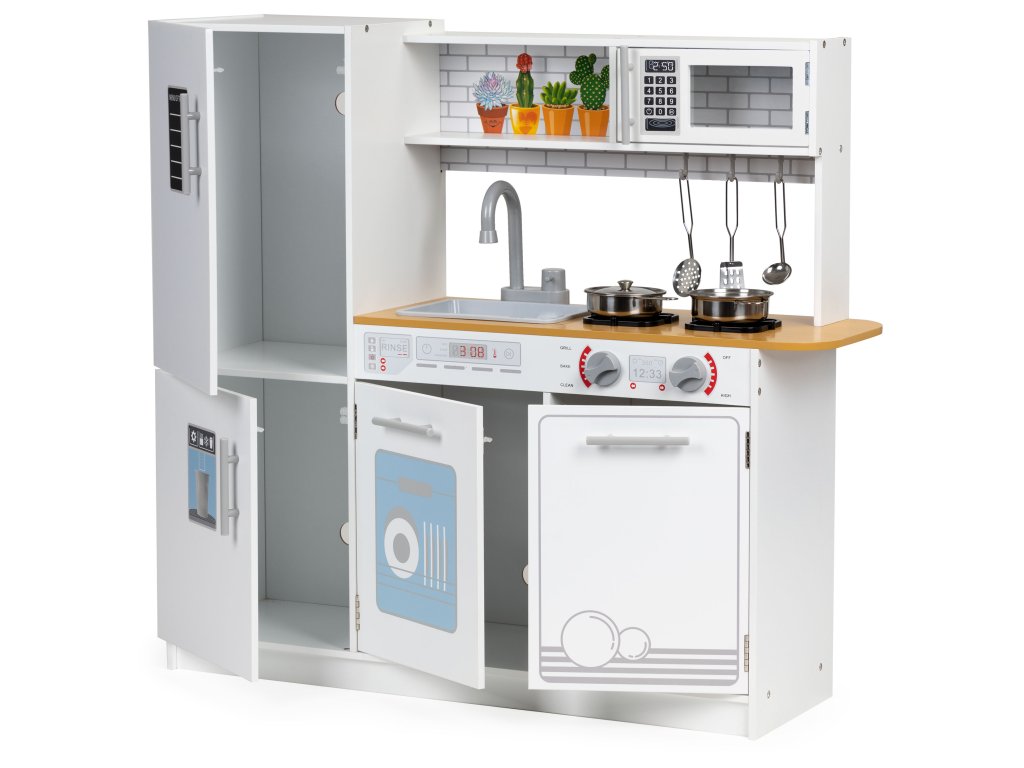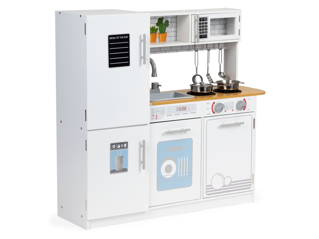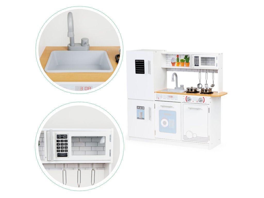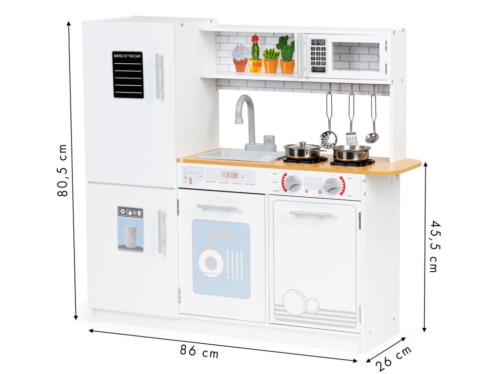 Díky této kuchyni všechny děti rády napodobují dospělé Vaše dítě bude mít možnost převzít roli kuchaře/šéfkuchaře. K vybavení šéfkuchaře patří. hořáky s otočnými knoflíky nastavit vhodnou teplotu. Pod horní částí se nachází trouba a myčky nádobí. Horní část je vybavena otevírací mikrovlnná trouba a další police na nářadí. V kuchyni byla samozřejmě prostorná kuchyňská linka chladničky s mrazákem a prostor pro psaní nákupních seznamů.