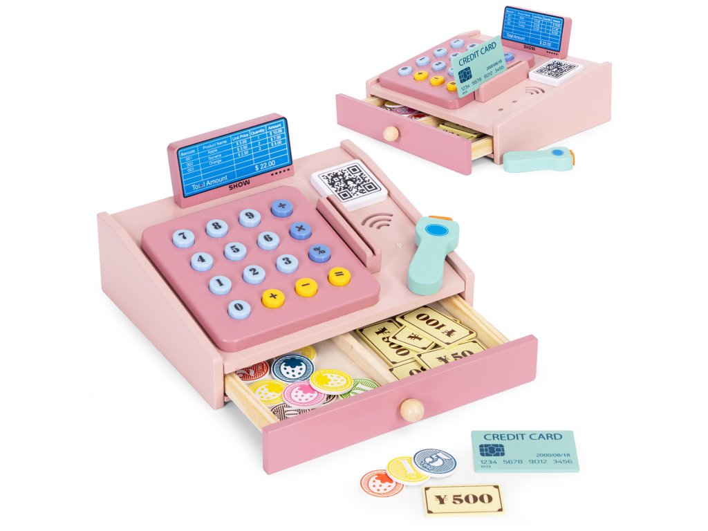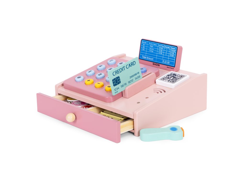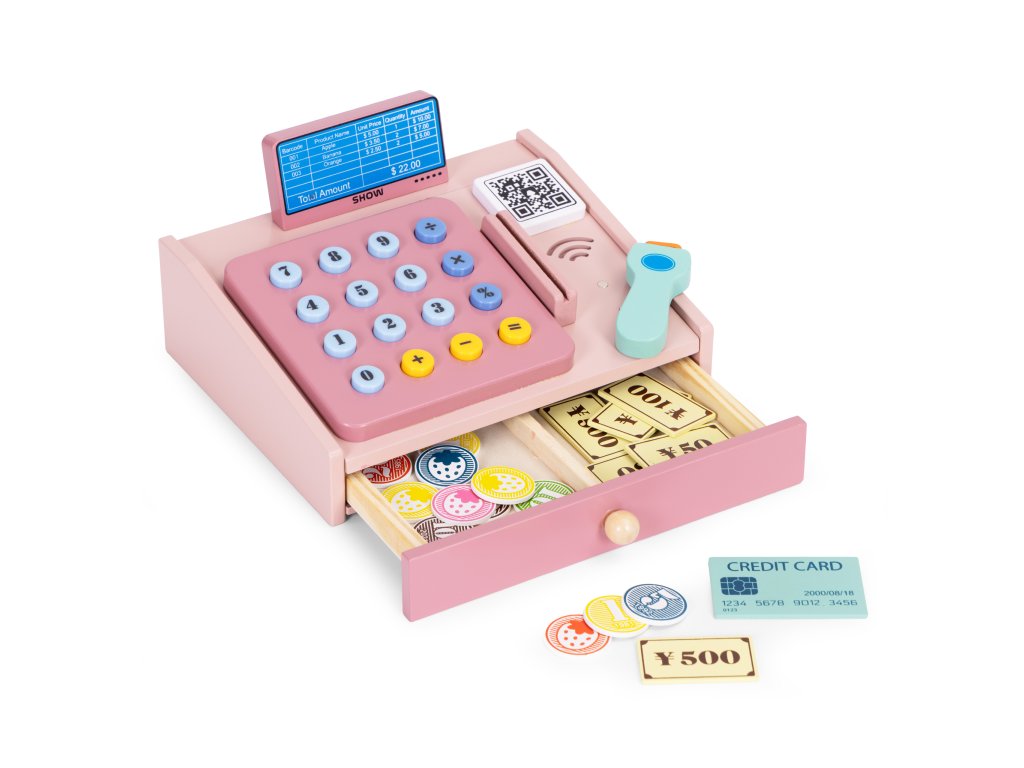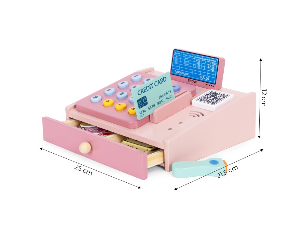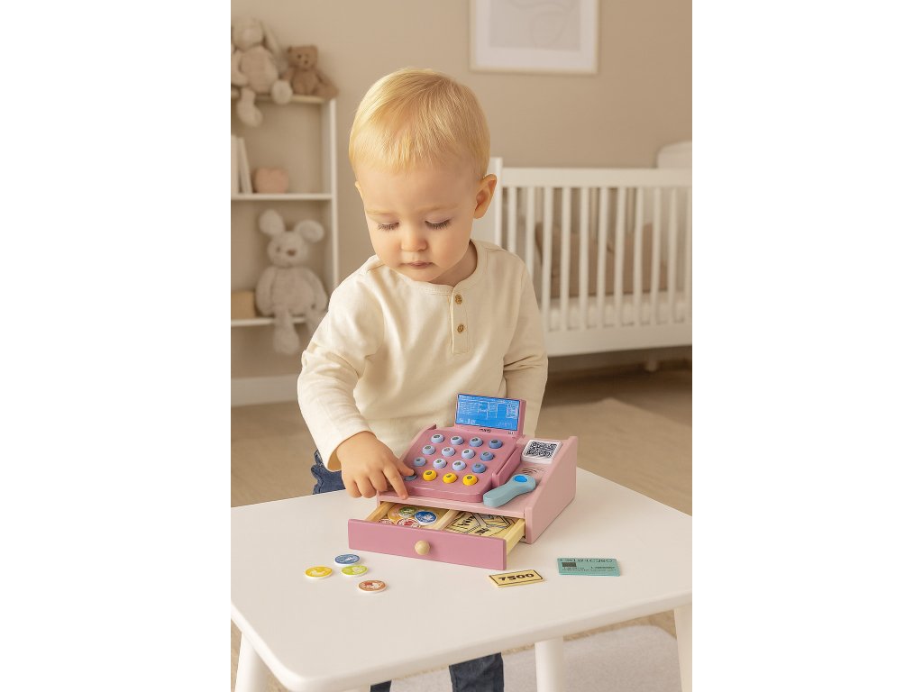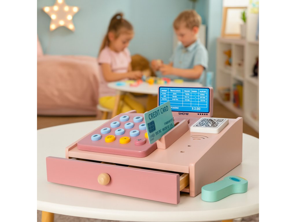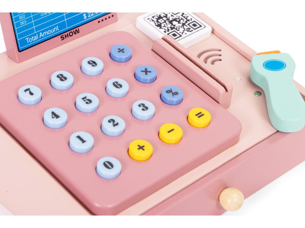 Dřevěná pokladna je skvělou volbou pro děti, které si rády hrají na prodavače. Realistické prvky - jako například skener, platební terminál, výsuvná zásuvka nebo kartu - aby hra byla nejen poutavá, ale také vzdělávací. Sada rozvíjí představivost, manuální zručnost a počítačová gramotnost , které dítě uvedou do fascinujícího světa nakupování a financí. Zaoblené hrany a pastelové barvy aby pokladna byla nejen funkční, ale také estetická. Je to víc než jen obyčejná hračka - je to cenné zkušenosti která učí hrou. Objednejte si nyní a otevřete svému dítěti dveře k tvůrčímu dobrodružství!