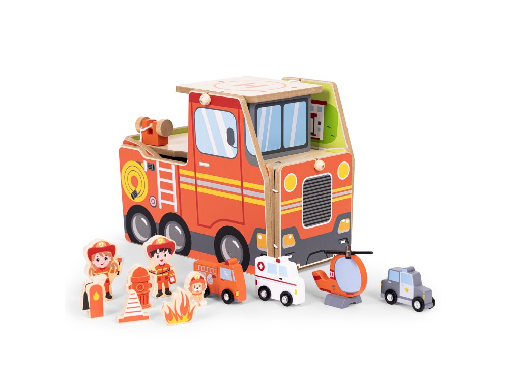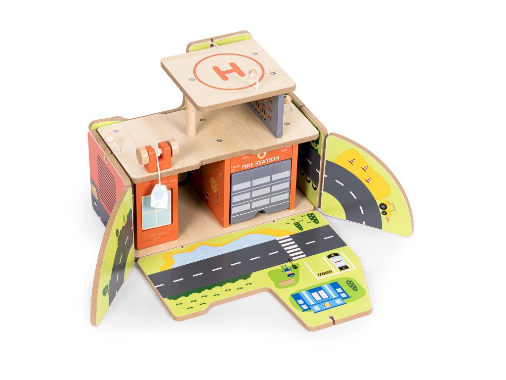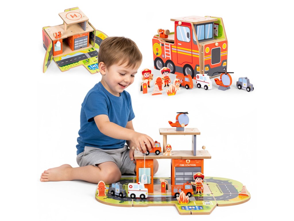 Drevená hasičská stanica 2v1 s vozidlami a 11 dielmi