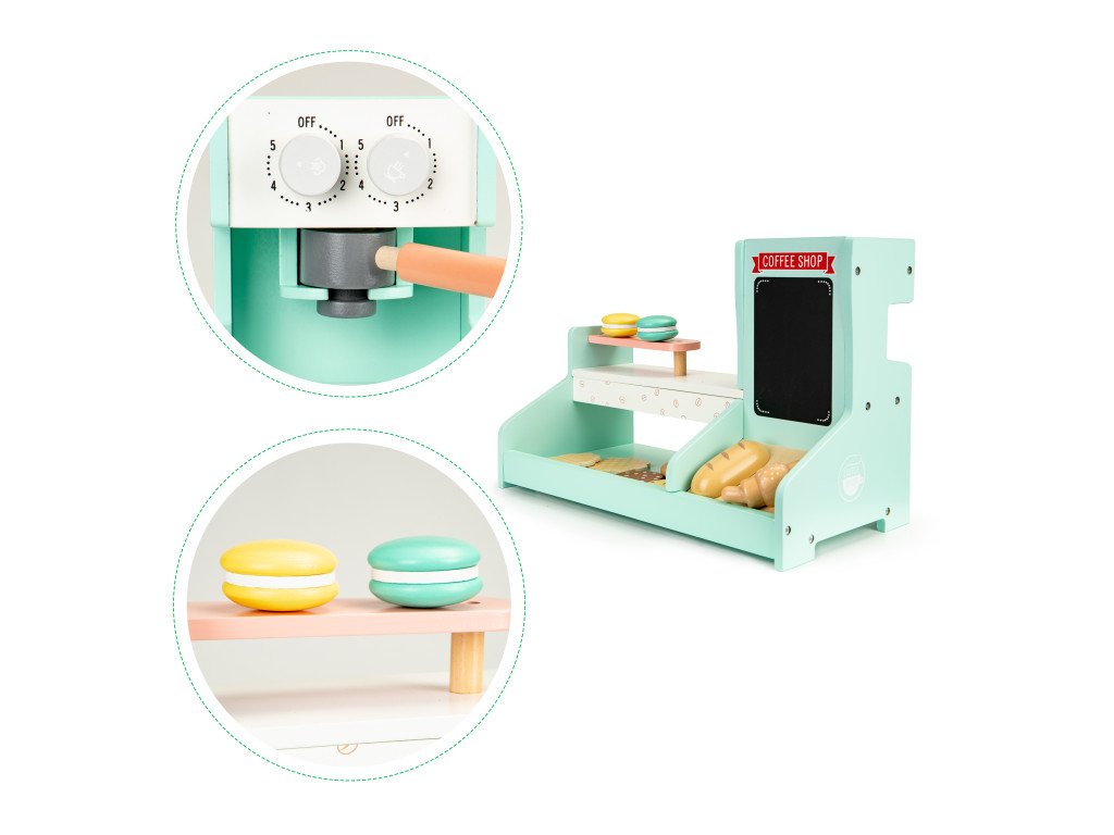 Barevné makronky, dorty, preclíky nebo pečivo jsou předměty, se kterými si můžete hrát podle libosti. W kávovar na hračky kávu lze připravit přímo do dřevěný pohár . Pohyblivé ovládací prvky, které vydávají zvuk jistě zaujmou malé dítě.