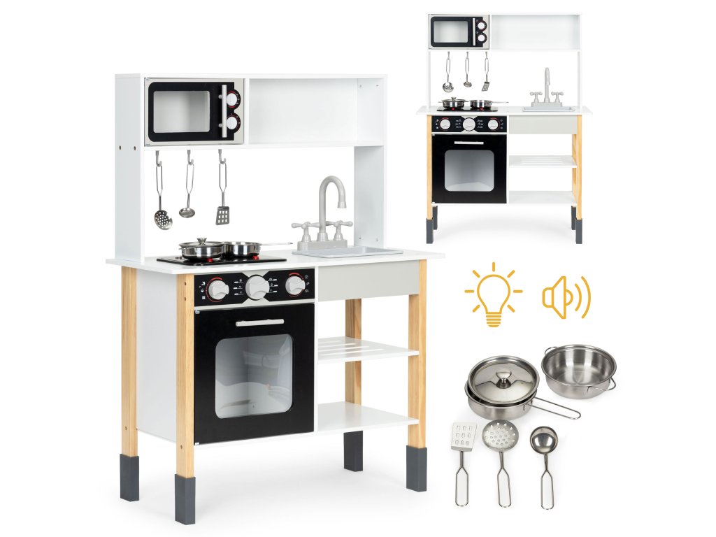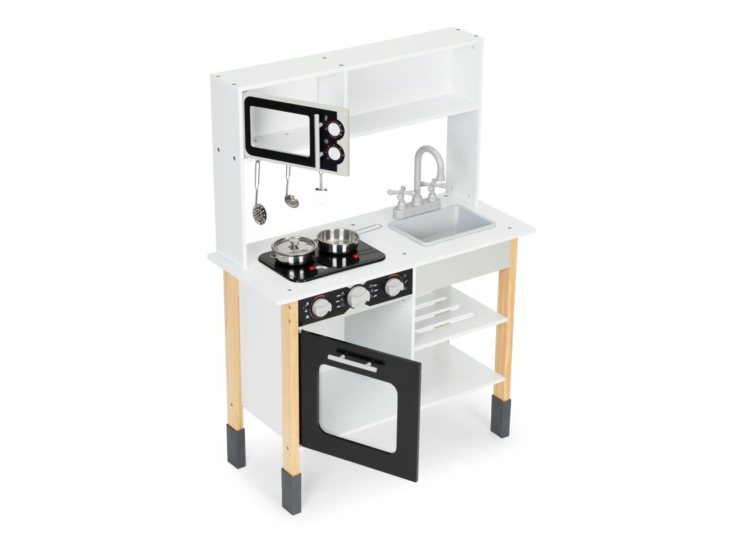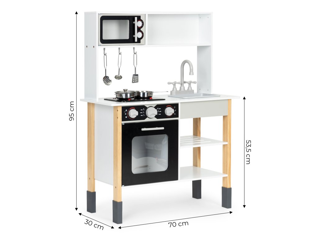 Díky Díky ECOTOYS se děti budou cítit jako ve skutečné kuchyni, a zábava při přípravě jídel pro celou rodinu bude nekonečná. Kuchyně je vyrobena z odolných panelů a dřevěných prvků, což mu dodává autentický a jedinečný vzhled, jeho konstrukce neobsahuje ostré hrany, a proto je pro děti bezpečný.