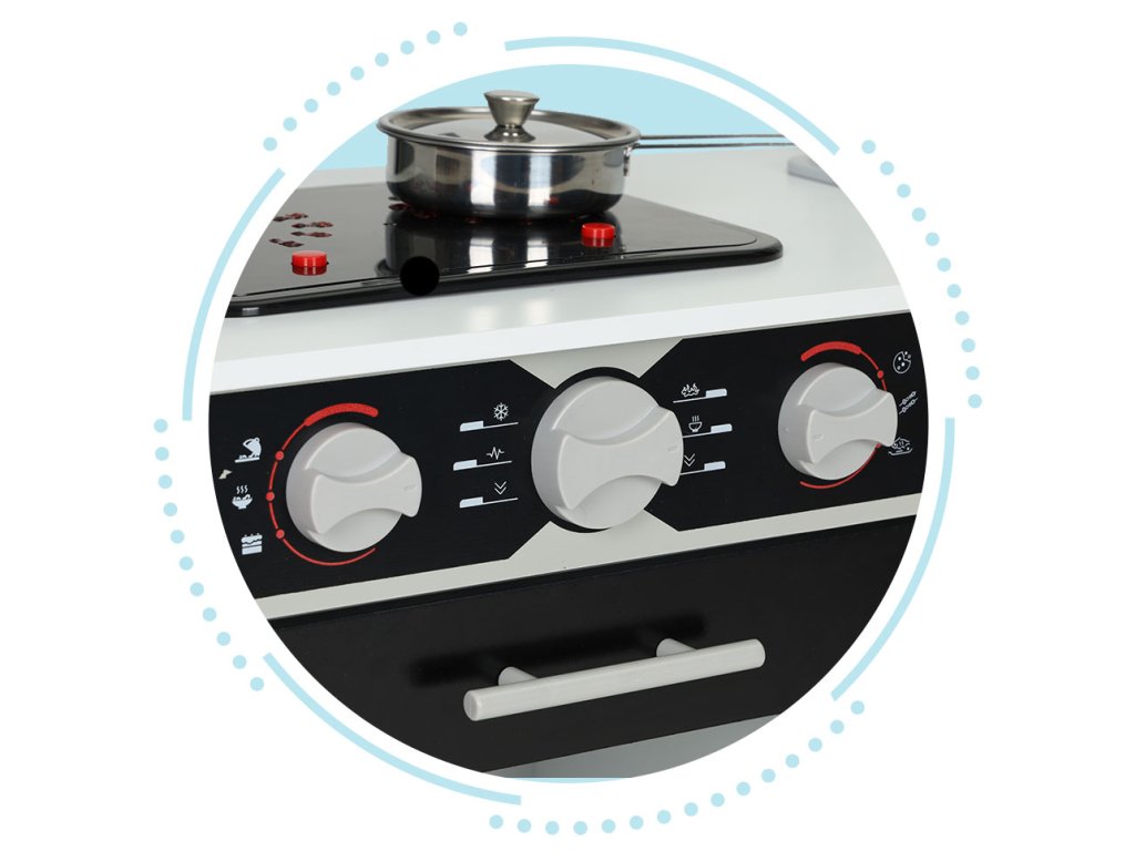 Vybavená kuchyně je vybaven otočnými knoflíky, které umožňují simulovat provoz sporáku a trouby. Děti mohou regulovat teplotu, měnit nastavení hořáků, které jim umožňují vytvářet různé scénáře a pokrmy, s nimiž si mohou hrát , bez rizika popálení. Je to vynikající příležitost kreativní hraní a experimentování v bezpečném prostředí.