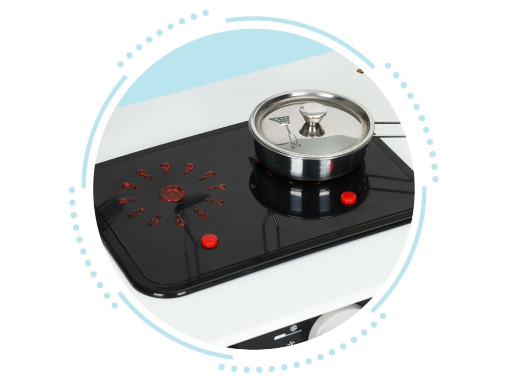 V kuchyni jsou hračky hořáky, které vizuálně připomínají skutečnou indukční varnou desku. Děkujeme jim, hra se stává ještě poutavější, a přiložené příslušenství je skvělým doplňkem, který vám umožní vařit a smažit nejrůznější pokrmy. Stisknutím červených tlačítek aktivujete hořáky v kamnech, která jsou osvětlena a při vaření vydávat zvuky.