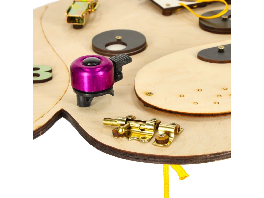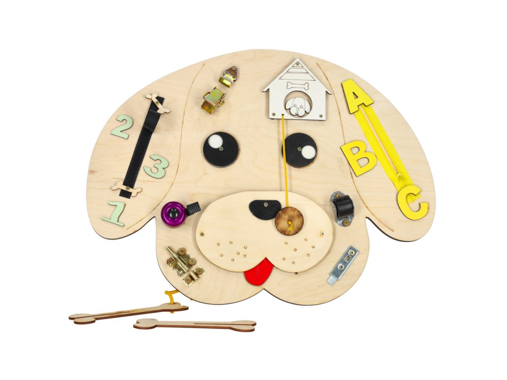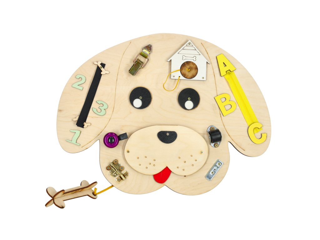 Dřevěná manipulační deska pro děti s různými herními prvky: pohyblivé oči, čísla a písmena, zámek, zip, zvonek, posuvníky a kolečko. Součástí je také otevíratelná bouda s pejskem a kostí. Zábava a učení v jednom!
