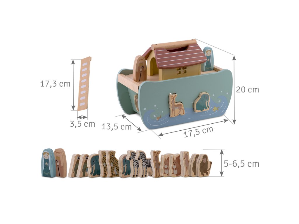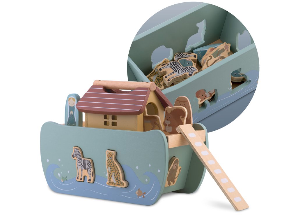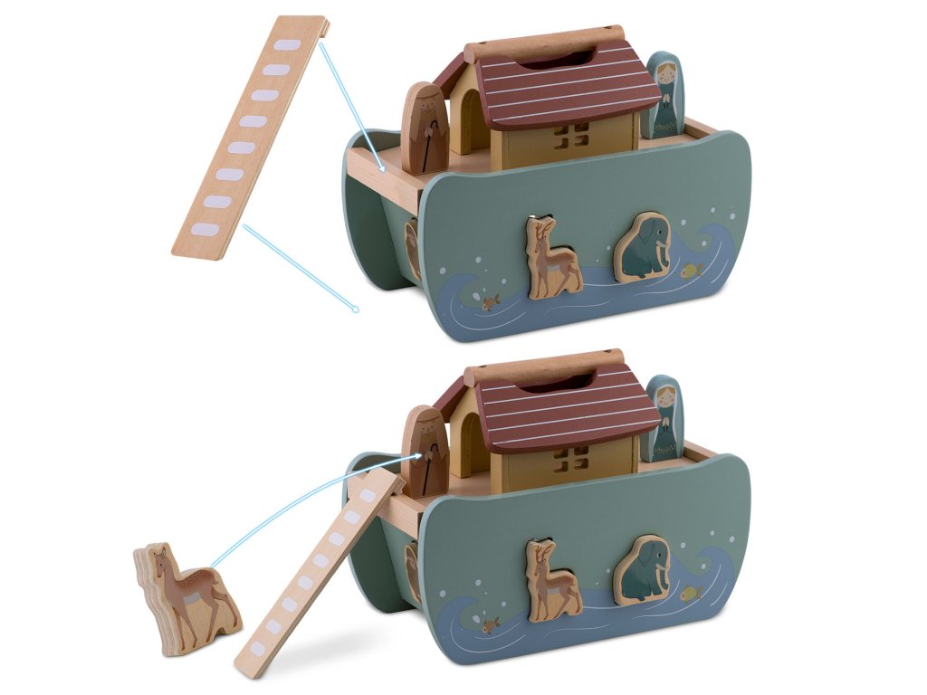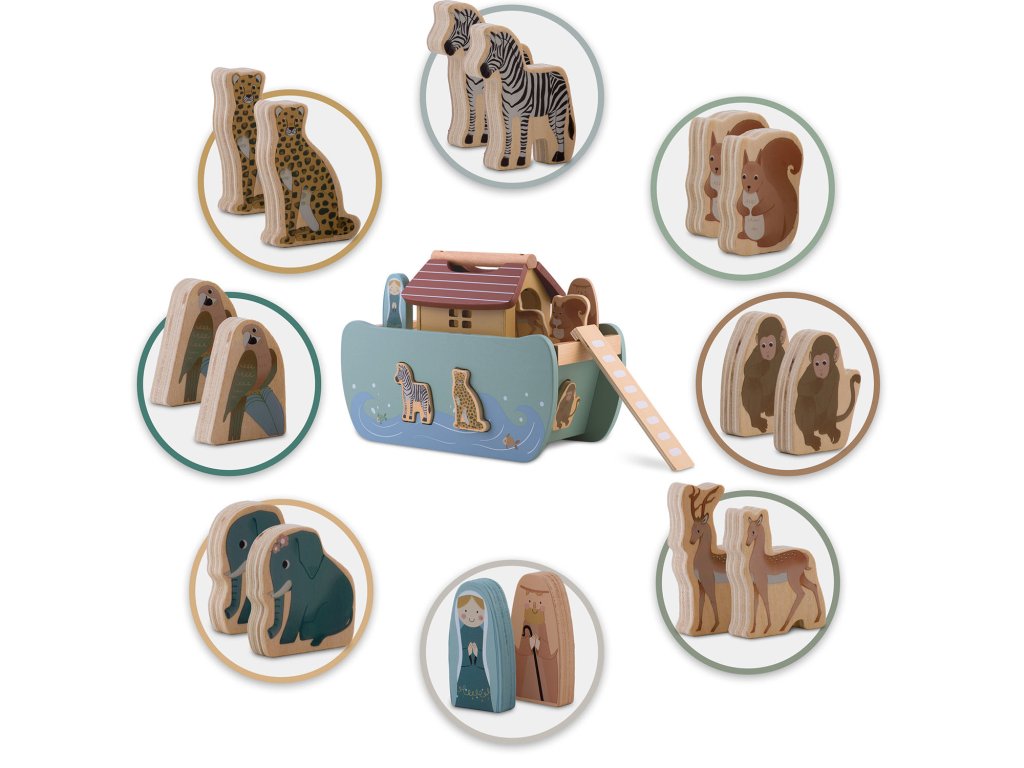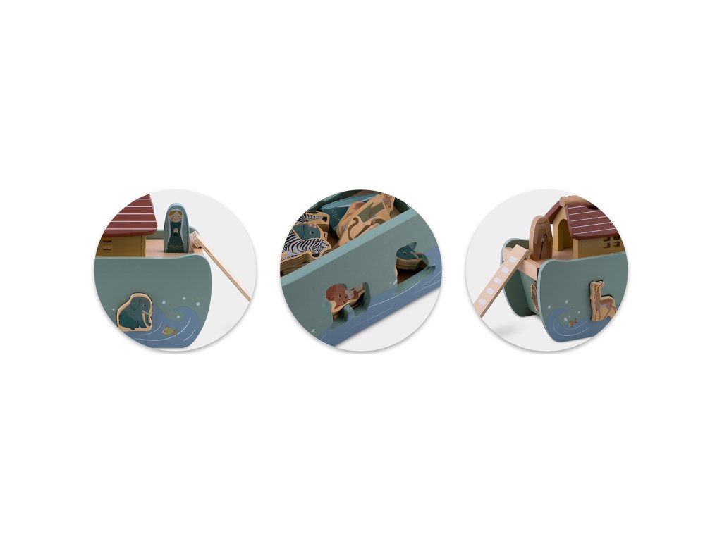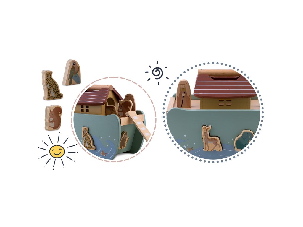 Noemova archa obsahuje sadu pohyblivých zvířat a podporuje hru a zkoumání, čímž rozvíjí motorické dovednosti dítěte.