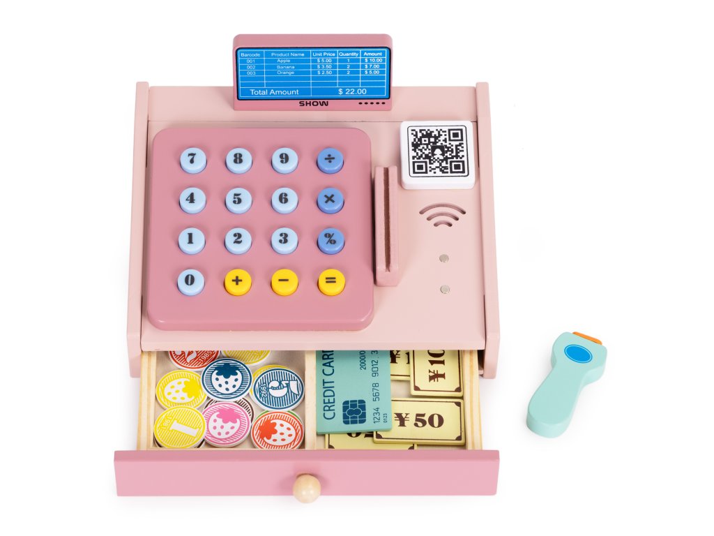 Dřevěná pokladna pro děti skener bankovek karta mincí