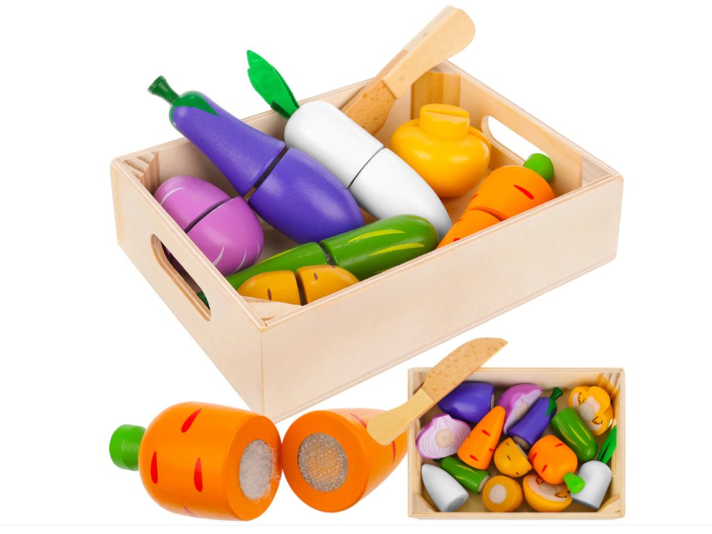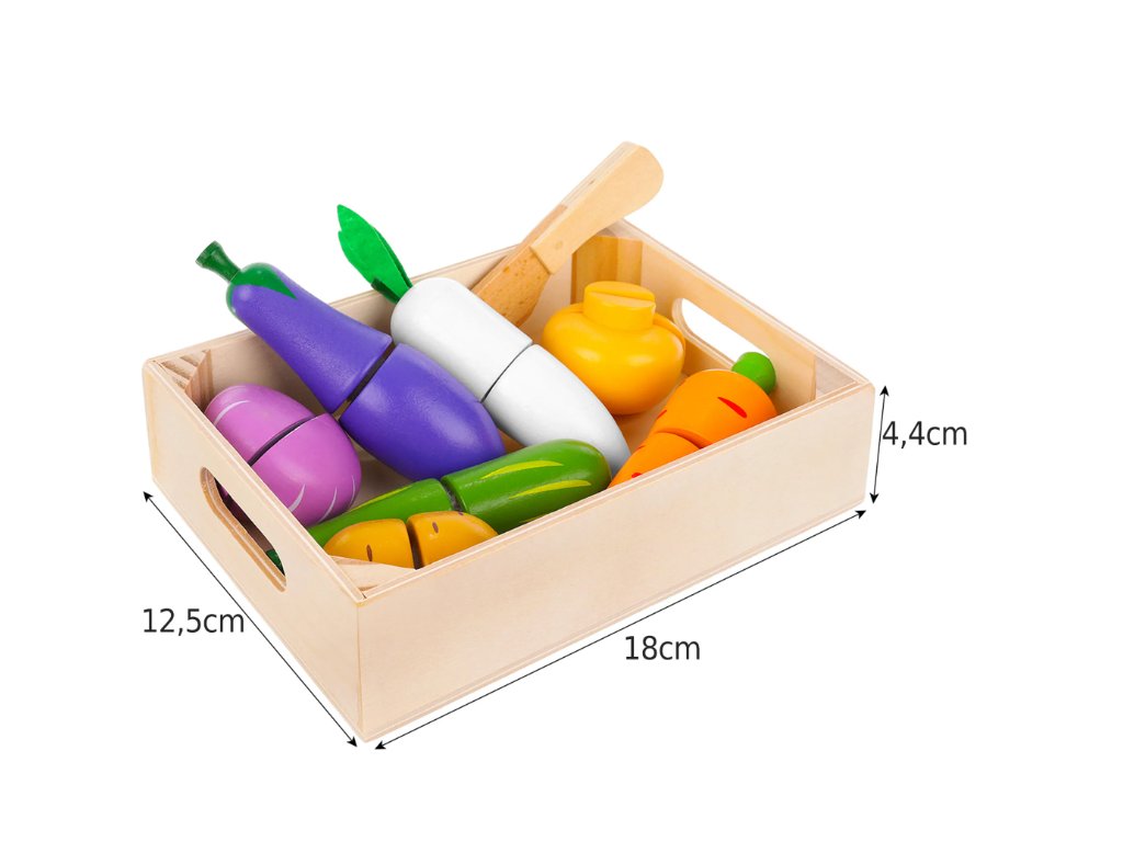 Dřevěné ovoce a zelenina. Skvělá zábava pro nejmenší. Krájení nožem je skvělým cvičením koordinace očí a rukou. Sada obsahuje: různé druhy ovoce, zeleniny, nůž.