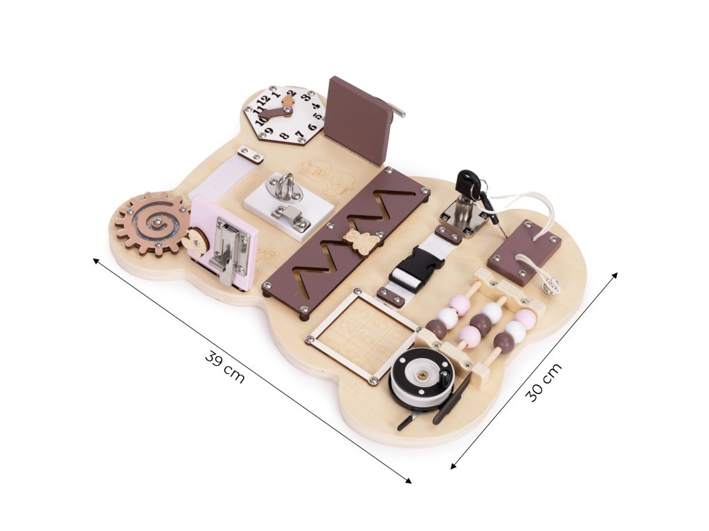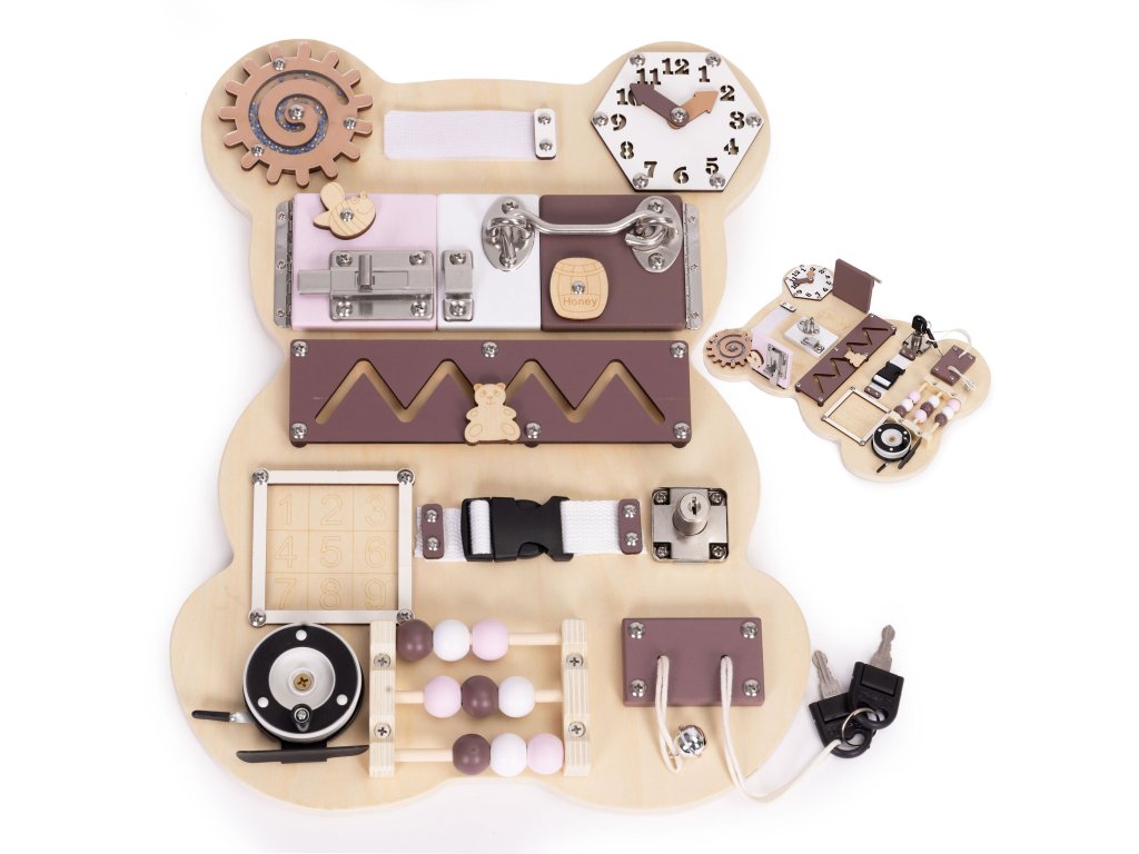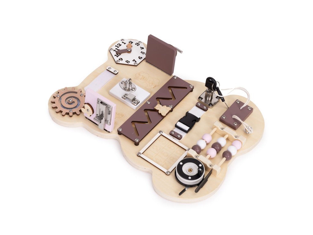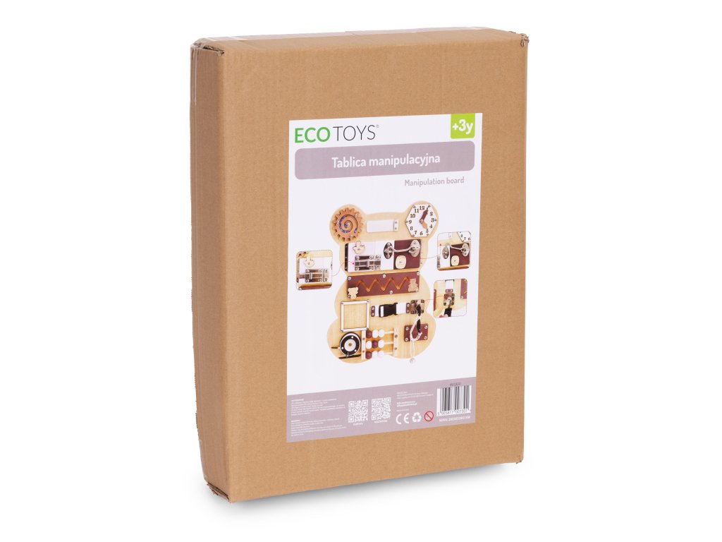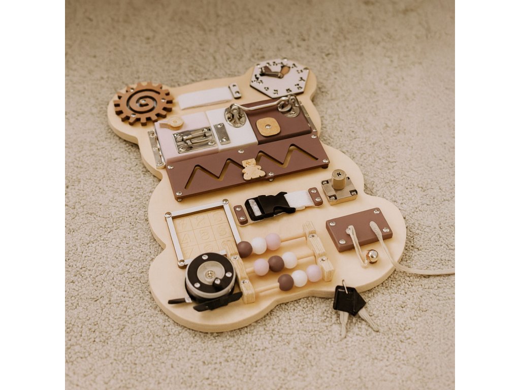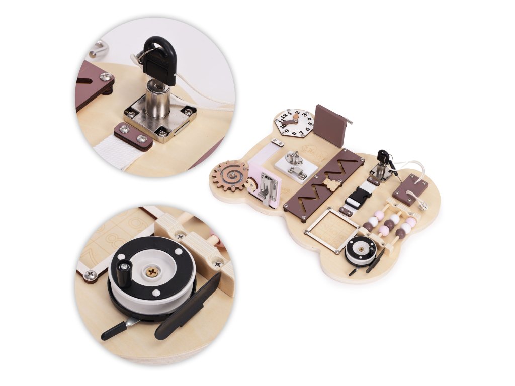 Dřevěná smyslová manipulační deska pro děti vzdělávací panel medvídek 12 prvků ECOTOYS