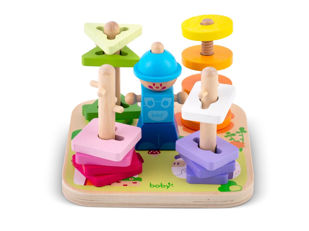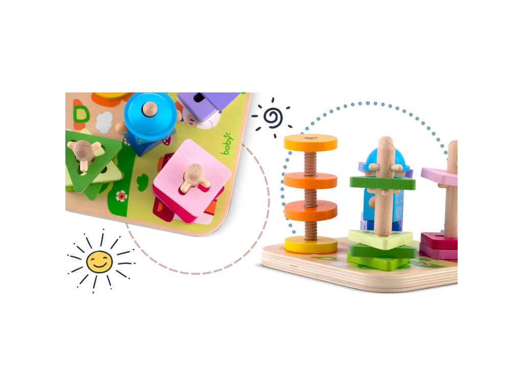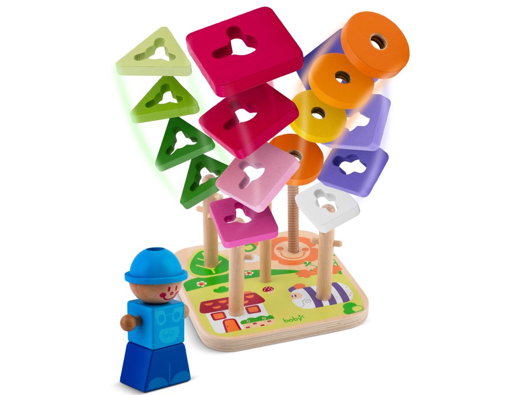 Výrazné barvy stimulují zrak dítěte, usnadňují učení barev a podporují rozvoj zrakového vnímání. Použité bezpečné barvy a odolné dřevo navíc zajišťují, že hračka je bezpečná i pro nejmenší uživatele a vydrží dlouhá léta.