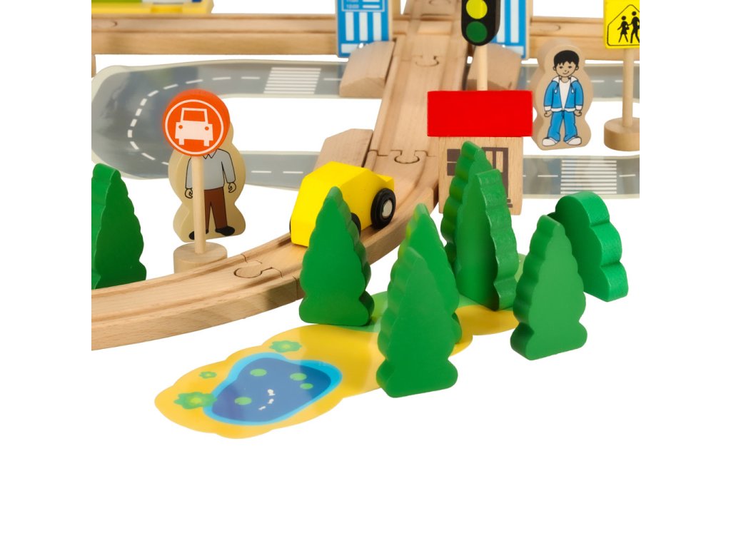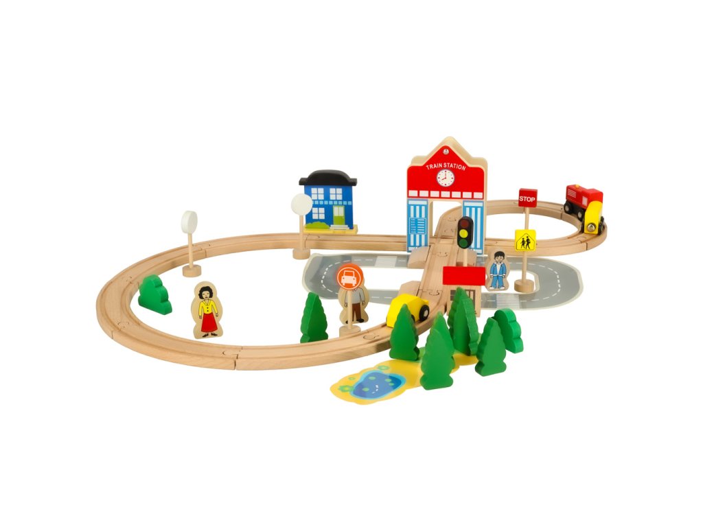 Kromě kolejí sada obsahuje vlak s vagónem, auto, budovy, figurky a dekorace města, které můžete libovolně aranžovat a upravovat vytvořit tak vlastní město.