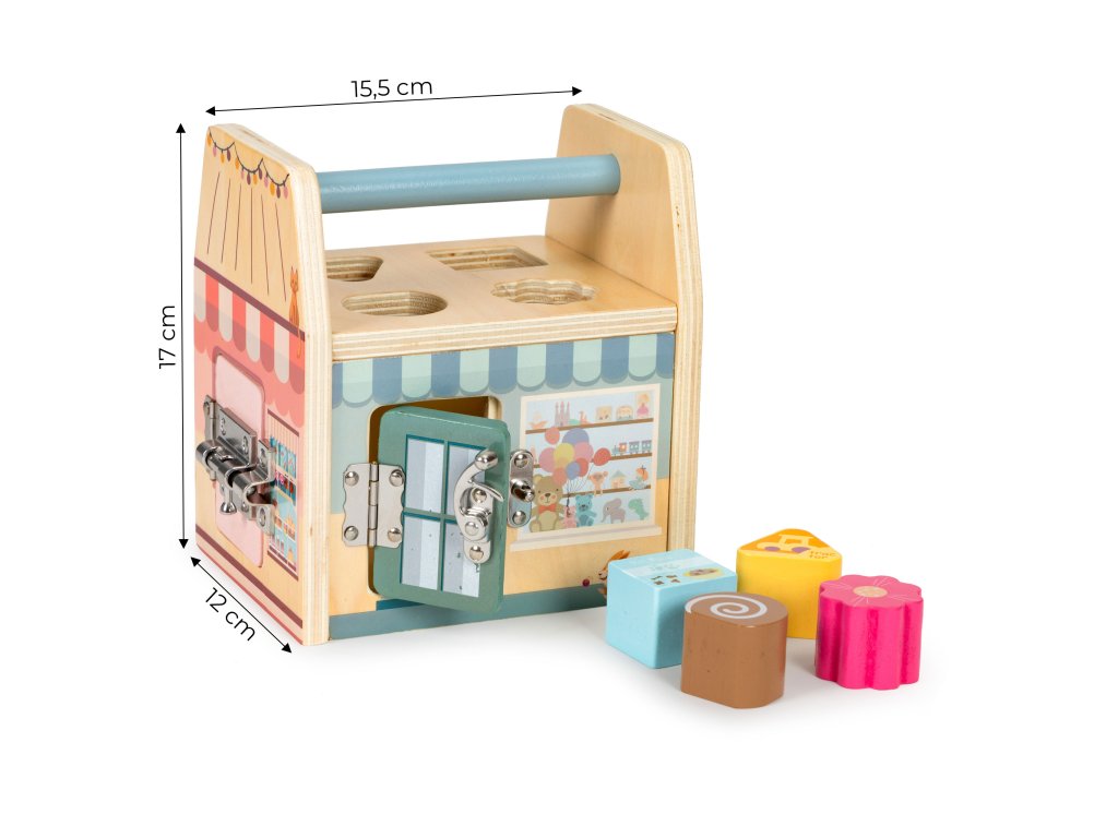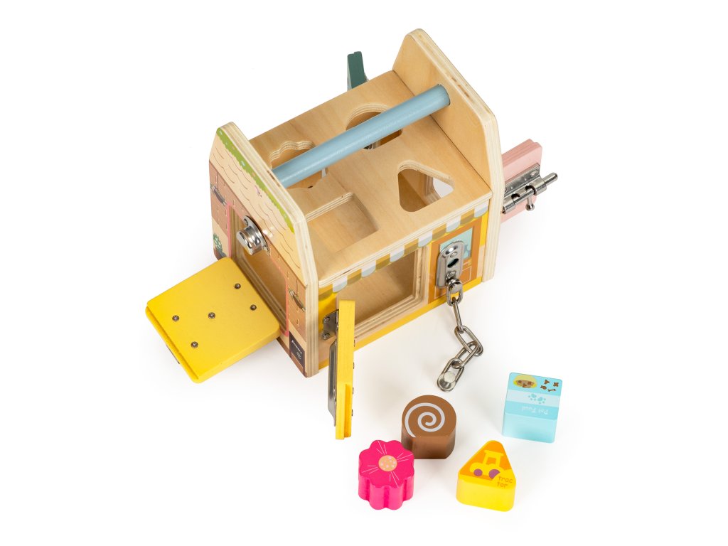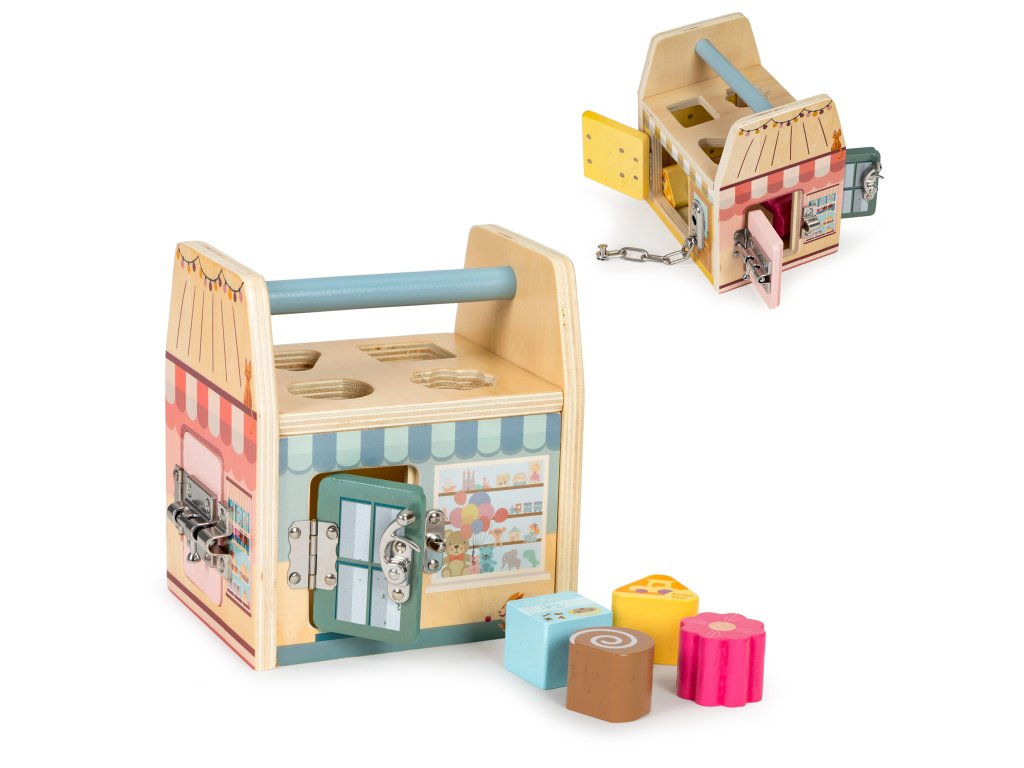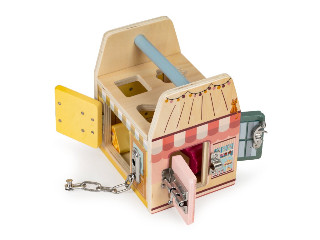 Je to jedinečná hračka, ktorá spája zábavu a vzdelávanie, drevená kocka ponúka veľa možností pre malých objaviteľov. Každé zo štyroch dverí je výzvou a zároveň hádankou, ktorú treba vyriešiť. Deti musia nájsť spôsob, ako otvoriť každý zámok, čím sa zapojí ich logické myslenie a schopnosť riešiť problémy.