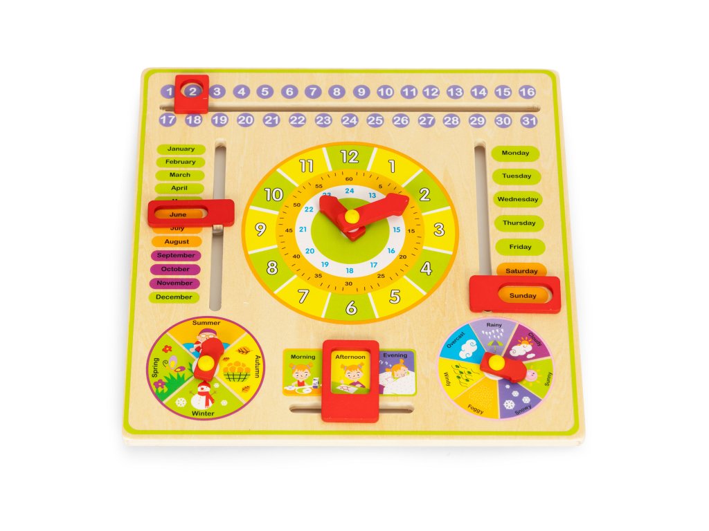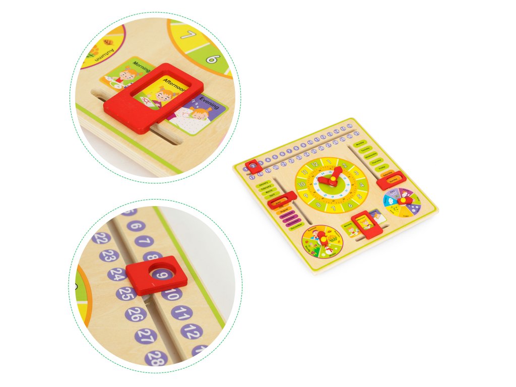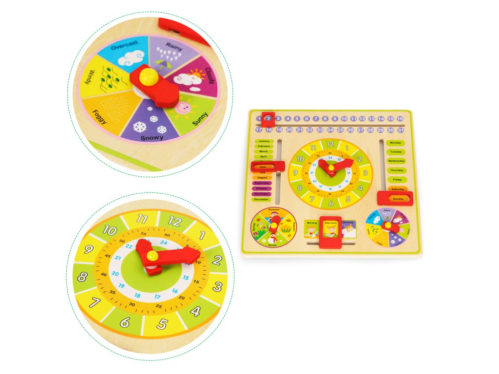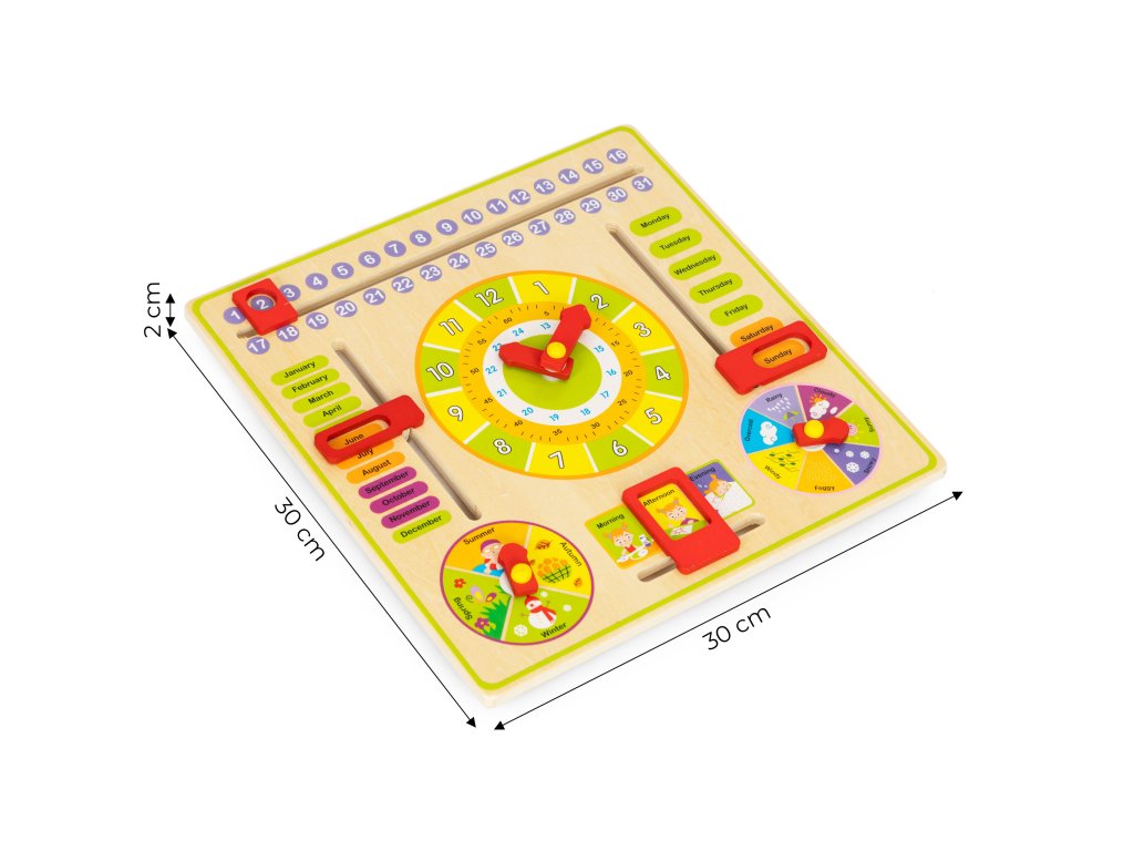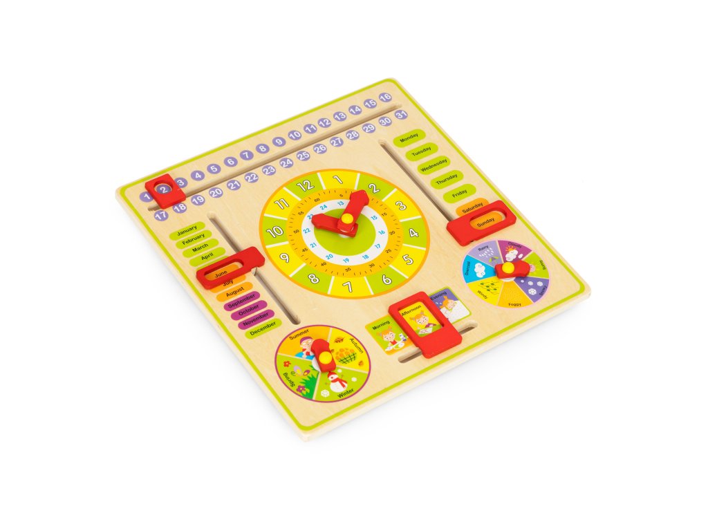 Zábavná dřevěná vzdělávací tabule pro děti od 3 let. Učí číst čas, dny v týdnu, měsíce a roční období. Bezpečné provedení, barevné, s anglickými slovíčky. Výborný způsob výuky a zábava pro děti. Vynikající pro rozvoj manuální zručnosti.