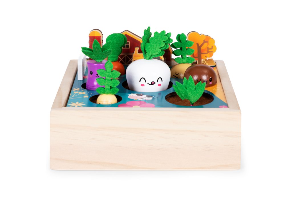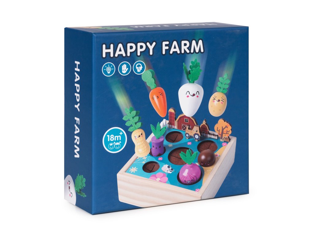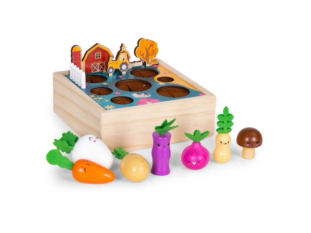 Hračka je vyrobená z dreva, nemá žiadne ostré ani nebezpečné hrany, takže je vhodný na hranie, aj pre najmenšie deti. Krabica sa dodáva s farebnými zelenina a prvky s grafikou traktora a stodoly.