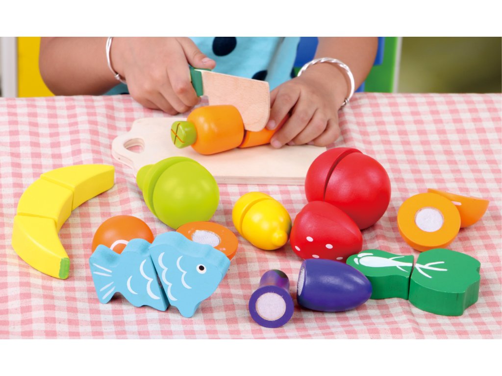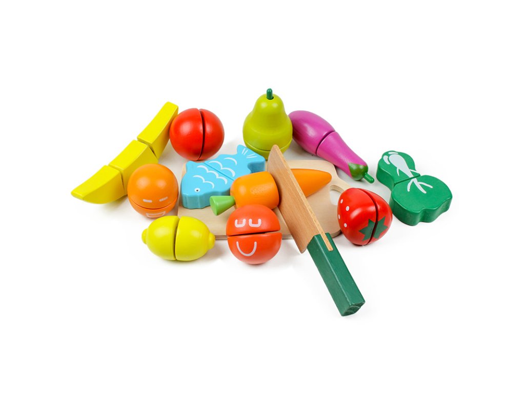 Sada drevených kusov zeleniny a ovocia na krájanie spolu s doskou a nožom. Je to fantastická hračka pre všetky deti, vďaka ktorej naučíte svoje dieťa rozpoznať ovocie a navyše vďaka skvelej zábave budete rozvíjať jeho predstavivosť a vedomosti o tom, čo je zdravé.