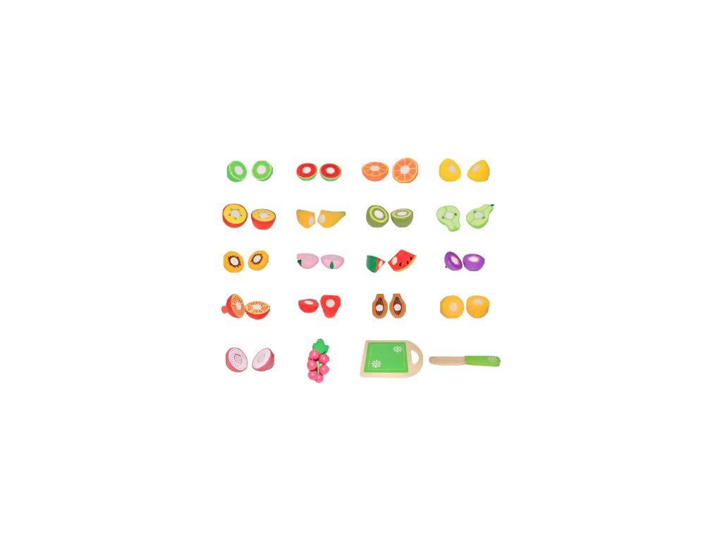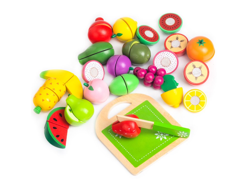 Všechny součásti sady jsou ze dřeva a byly pokryty s barvou bezpečnou pro děti. Kromě ovoce sada obsahuje také dřevěné prkénko a nůž. Ovoce se skládá z půlek spojených suchým zipem, který klade mírný odpor při krájení a při rozkrojení vydává zvuk skutečného krájení ovoce. Každá z nich byla vyrobena s velkým důrazem na detail a bezpečnost dětí, takže hračka neobsahuje nebezpečné prvky a ostré hrany.