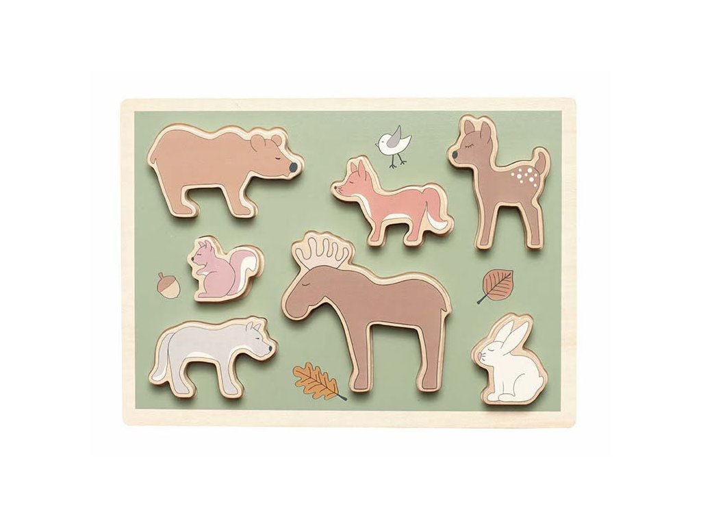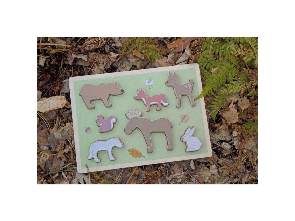Dřevěné puzzle s nejběžnějšími lesními zvířaty. Zvířátka jsou velmi snadno uchopitelná, aby se vešla do malých ručiček. S figurkami je také zábavné si hrát.
