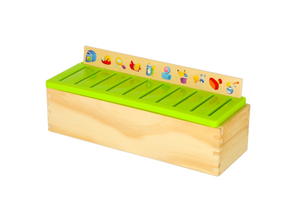 Hra spočívá ve vložení stejného obrázku, jaký je na velké dřevěné desce nad otvorem.