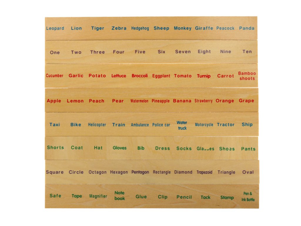 Na tabulkách jsou anglické názvy čísel, zvířat, předmětů atd..