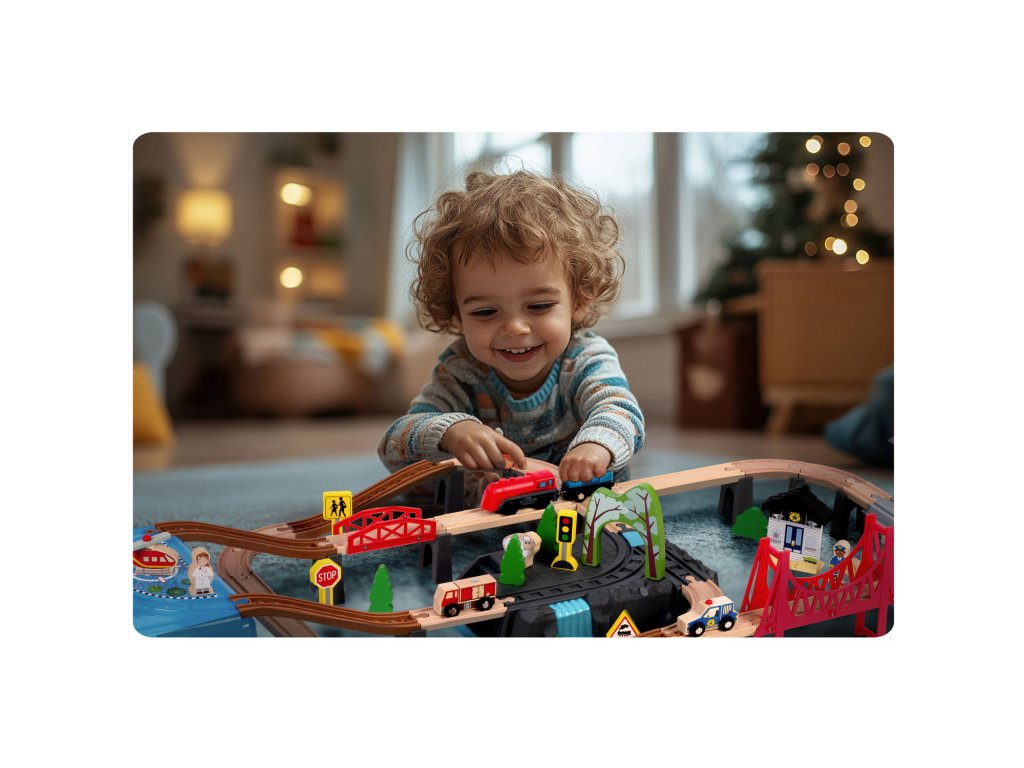 Konstrukce kolejí, vozidel a městských prvků je navržena tak, aby dítě mohlo hračku pohodlně a intuitivně uchopit.