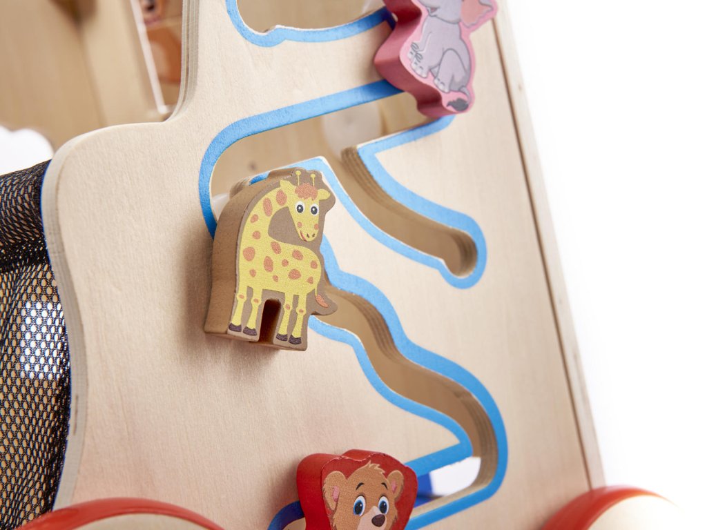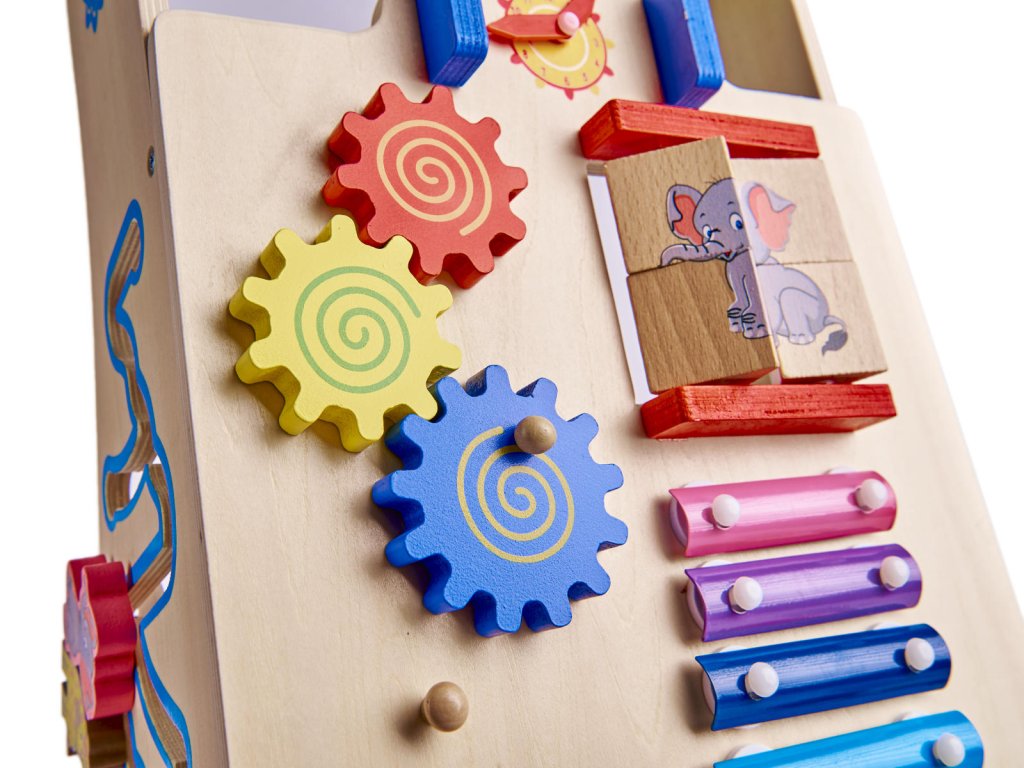 Barevné prvky přitahují oko i malé ručičky svými barvami. Díky neutrálnímu dřevěnému podkladu navíc hračka nepůsobí na dítě nadměrnými podněty.
