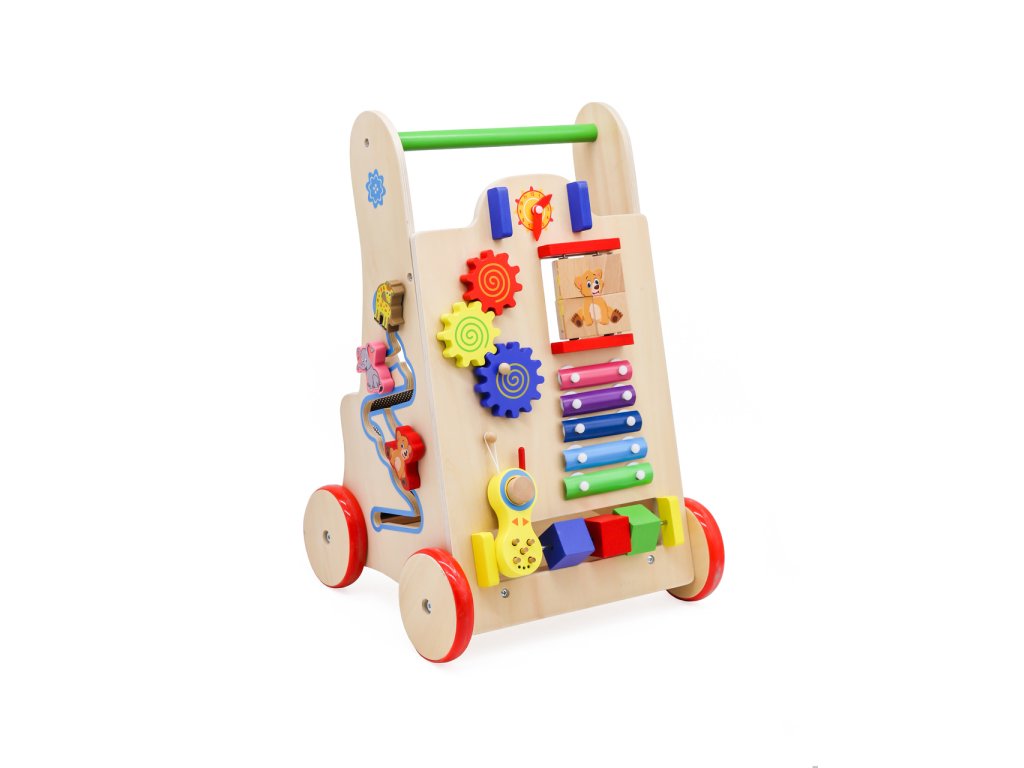 Není to jen chodítko! Tvůrci se postarali o to, aby se batolata zabavila mnoha způsoby. Na přední straně kočárku je manipulační deska plný prvků, které děti potěší: