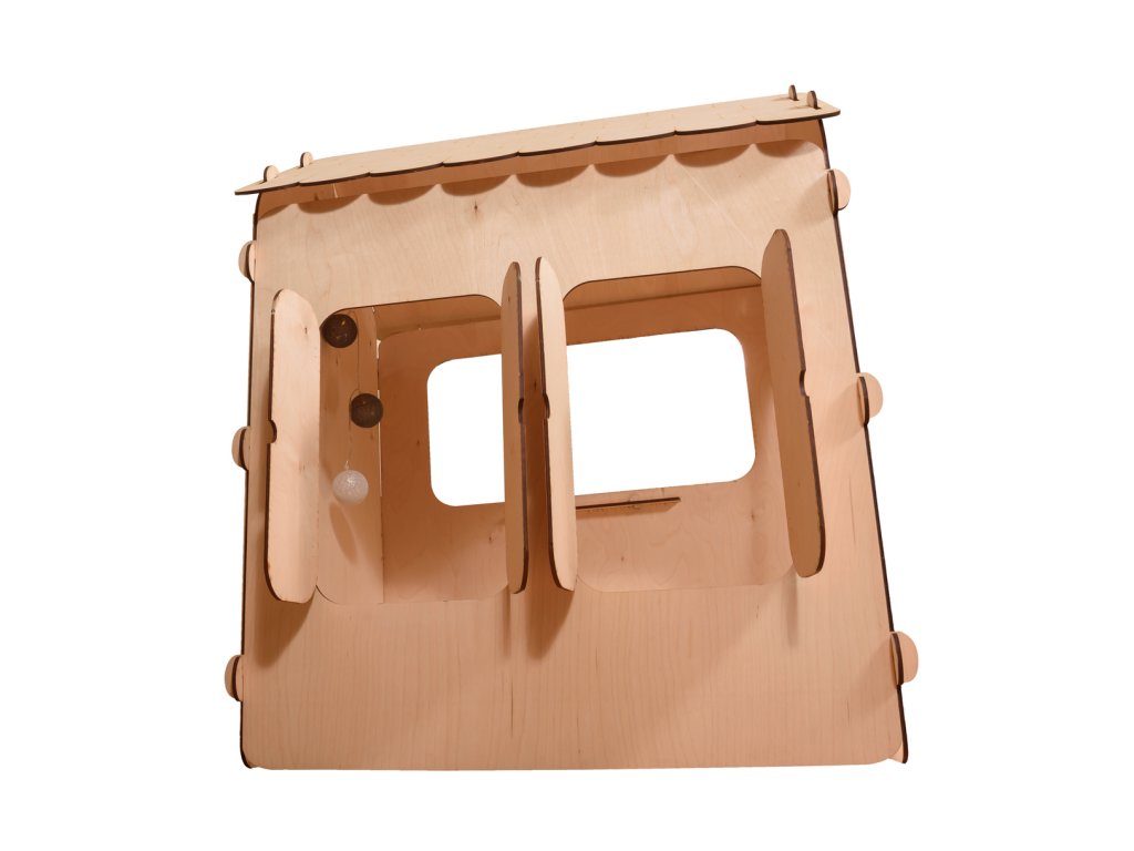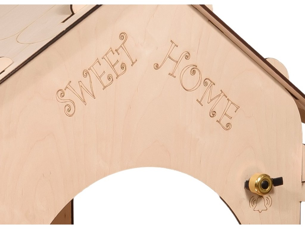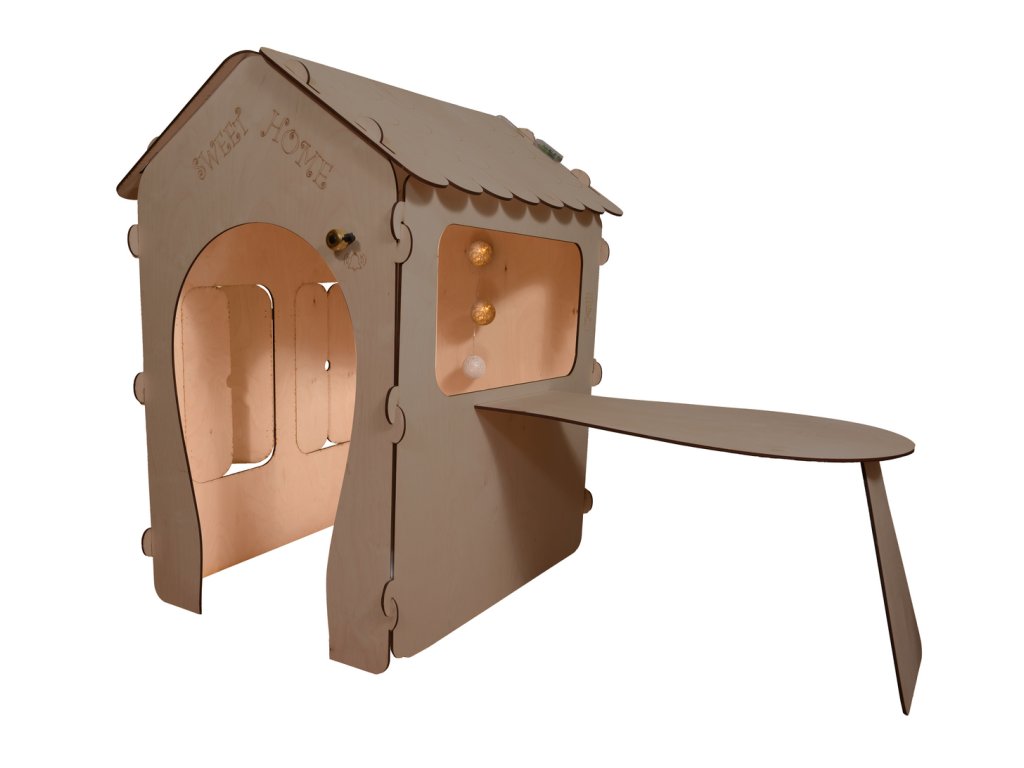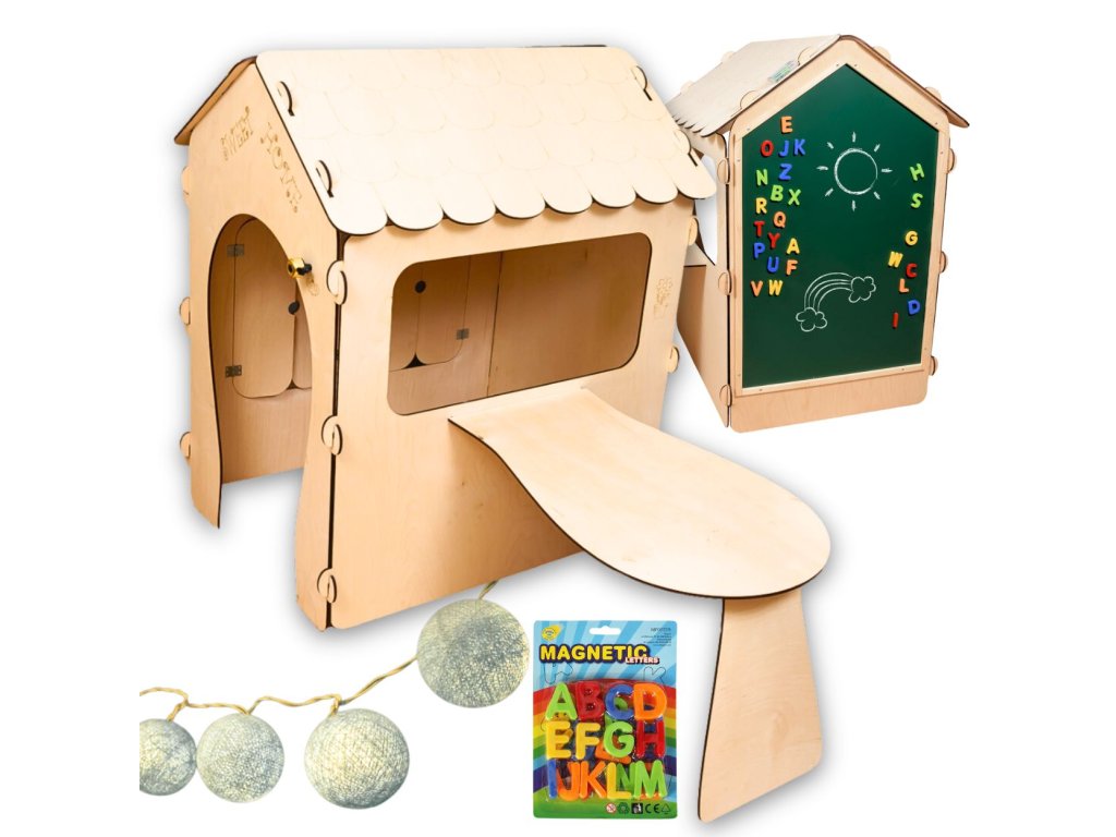 Aktivní dřevěný domeček "SWEET HOME" vybavený magnetickou tabulí (rozměr tabule: š: 55 x v: 86 cm) a stolkem (d: 76 cm, š: 45 cm) pro vlastní montáž. Příslušenství: sada magnetických písmen, 4 bavlnky, bílá křída a houbička. Sada neobsahuje baterie (2 AA).