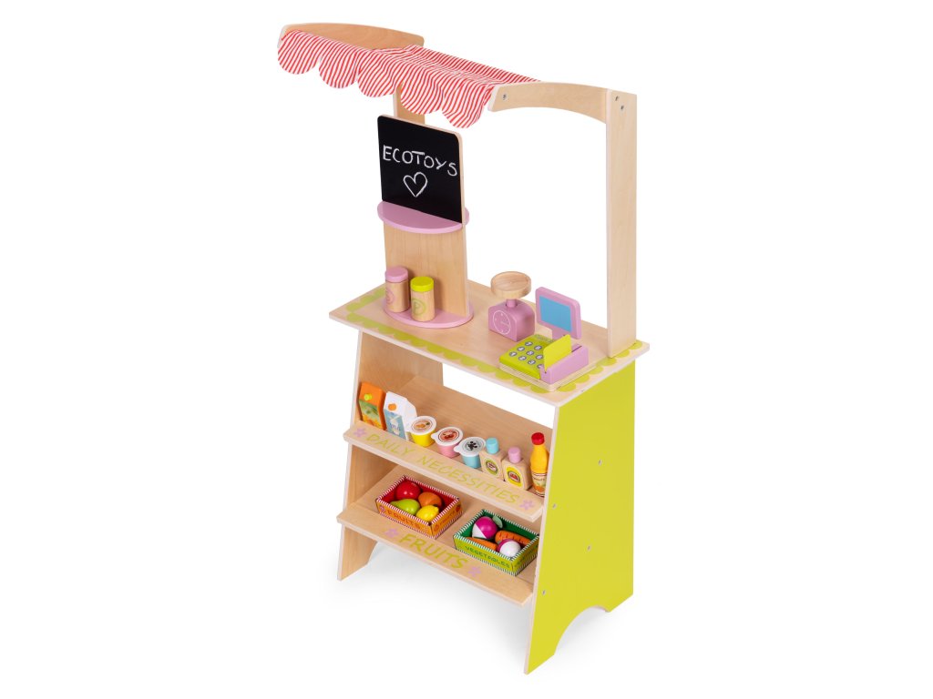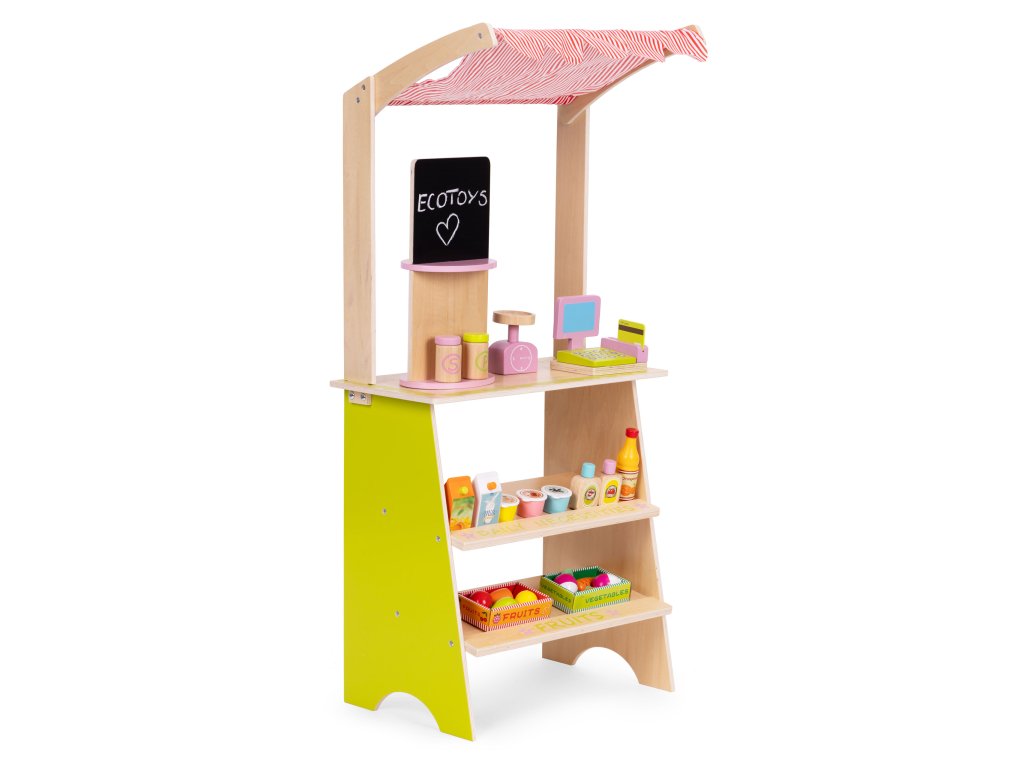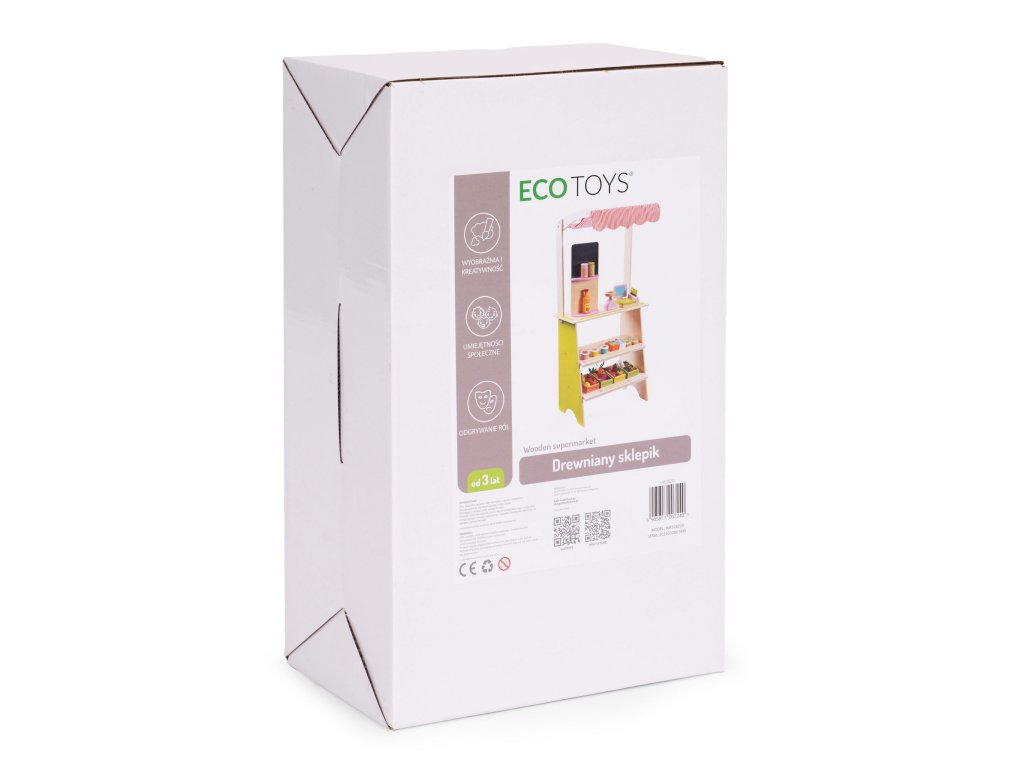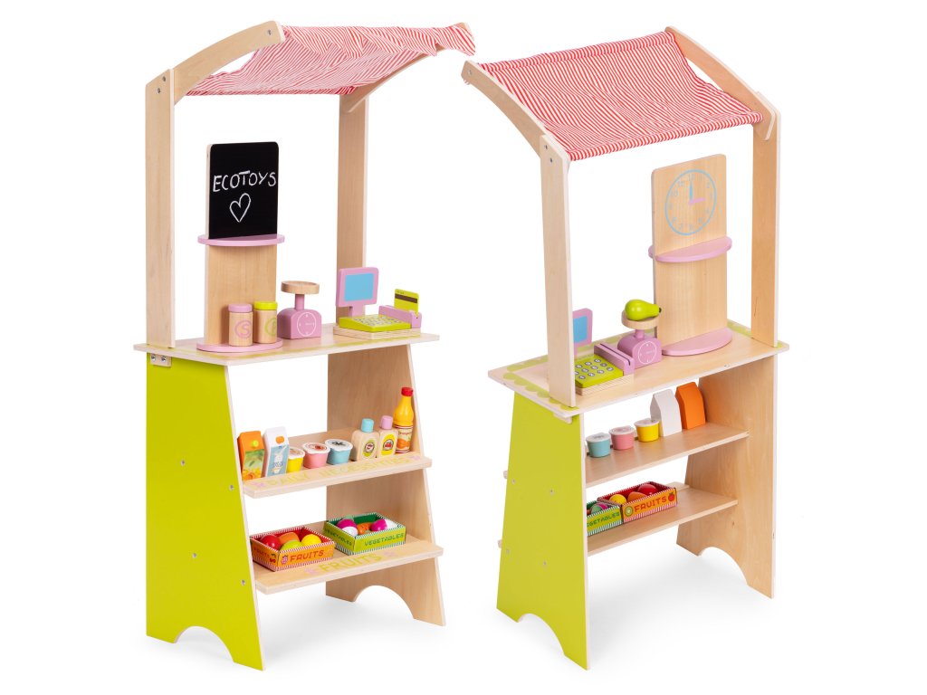 Dřevěný stojan ECOTOYS podporuje děti v aktivním hraní a učí je základnímu společenskému chování, jako je nakupování, prodávání a počítání. Tato hračka je ideální pro doma i v dětském pokoji nebo herně. Je to skvělý nástroj pro naučit se spolupracovat, komunikovat a kreativně myslet . Díky přítomnosti pokladny, terminálu, váhy a různých potravinářských výrobků se hra stává skutečné, a zároveň poutavé. Produkt rozvíjí koordinaci rukou a očí, podněcuje představivost a povzbuzuje dítě k samostatnému jednání.