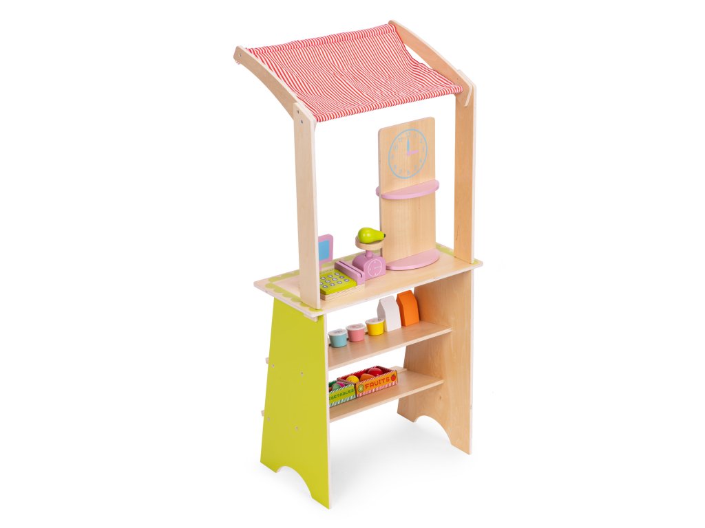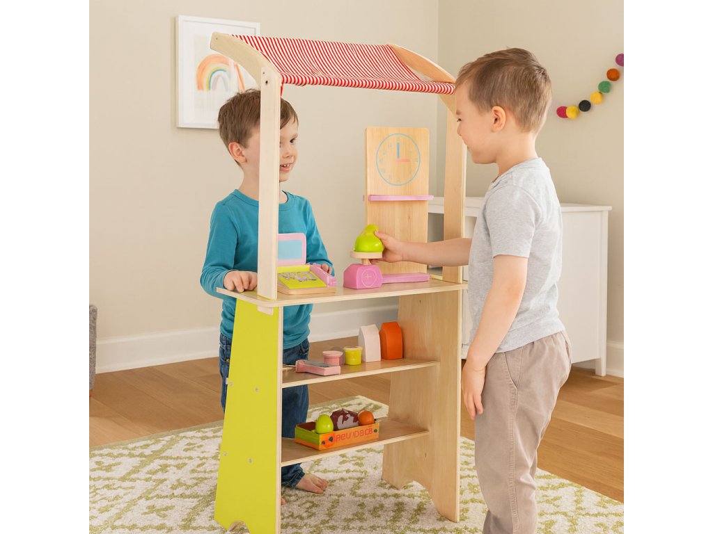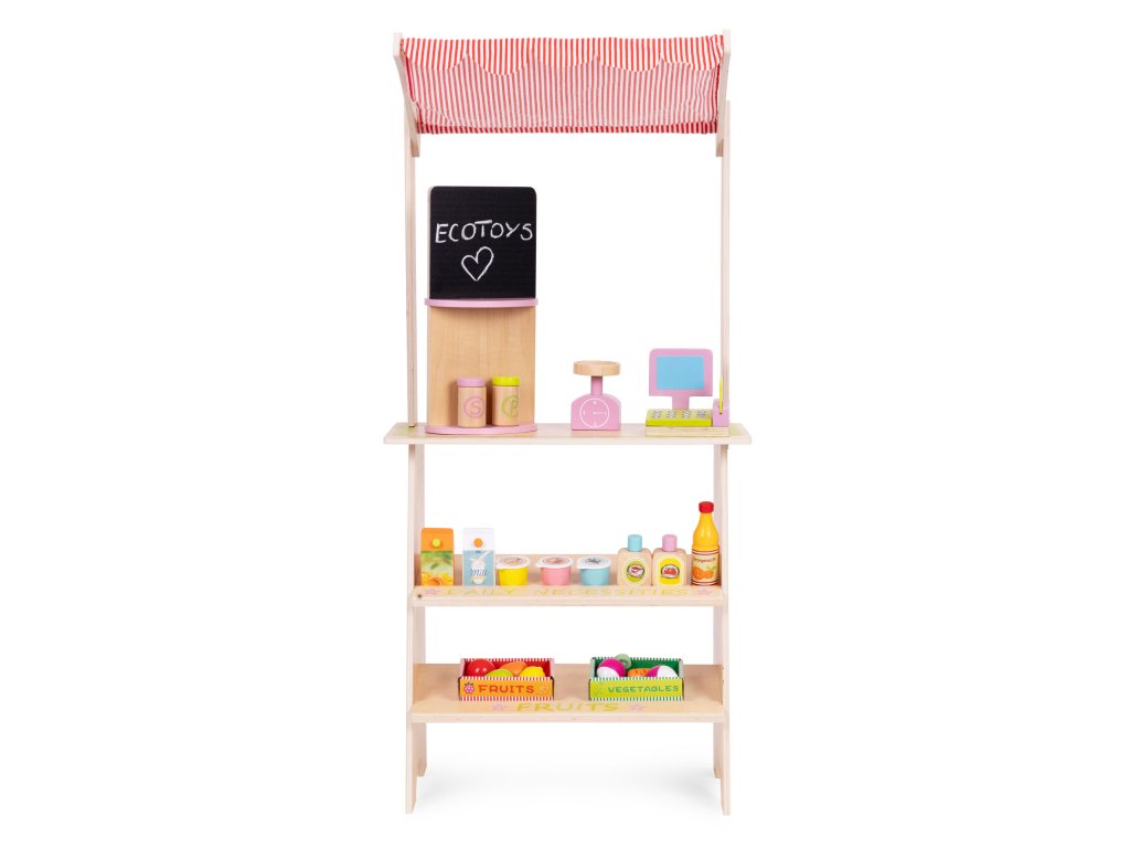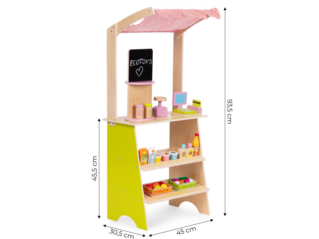 Dřevěný stojan ECOTOYS podporuje děti v aktivním hraní a učí je základnímu společenskému chování, jako je nakupování, prodávání a počítání. Tato hračka je ideální pro doma i v dětském pokoji nebo herně. Je to skvělý nástroj pro naučit se spolupracovat, komunikovat a kreativně myslet . Díky přítomnosti pokladny, terminálu, váhy a různých potravinářských výrobků se hra stává skutečné, a zároveň poutavé. Produkt rozvíjí koordinaci rukou a očí, podněcuje představivost a povzbuzuje dítě k samostatnému jednání.