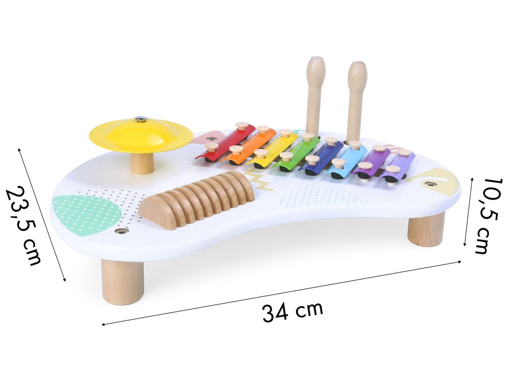 Rozvíjející se stolek se 3 hudebními nástroji pro děti od 18 měsíců. Pomáhá rozvíjet dovednosti a smysl pro rytmus. Ideální dárek s bezpečným designem a poutavou grafikou. Hmotnost 1,3 kg, rozměry 35x24x10 cm. Značka ECOTOYS.