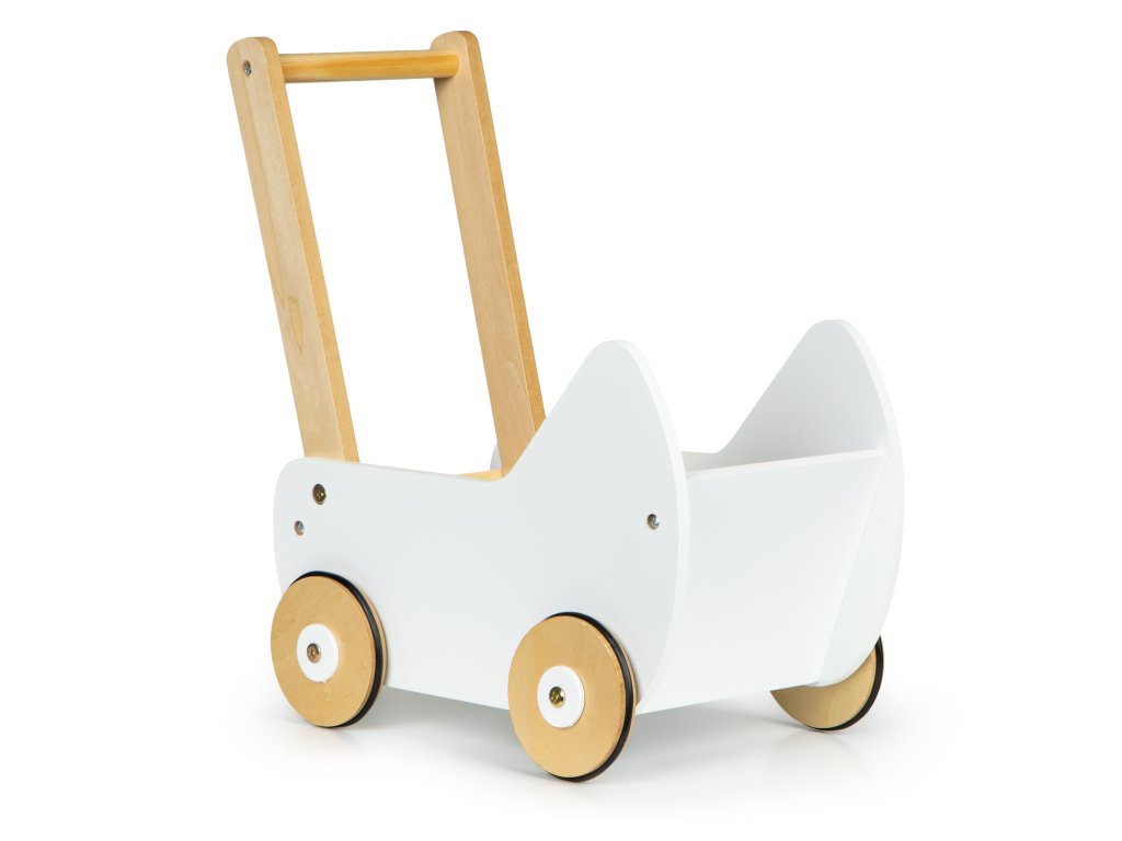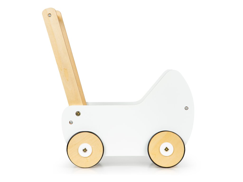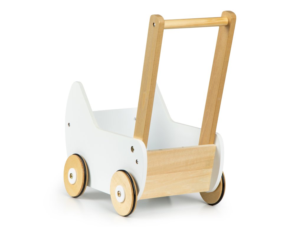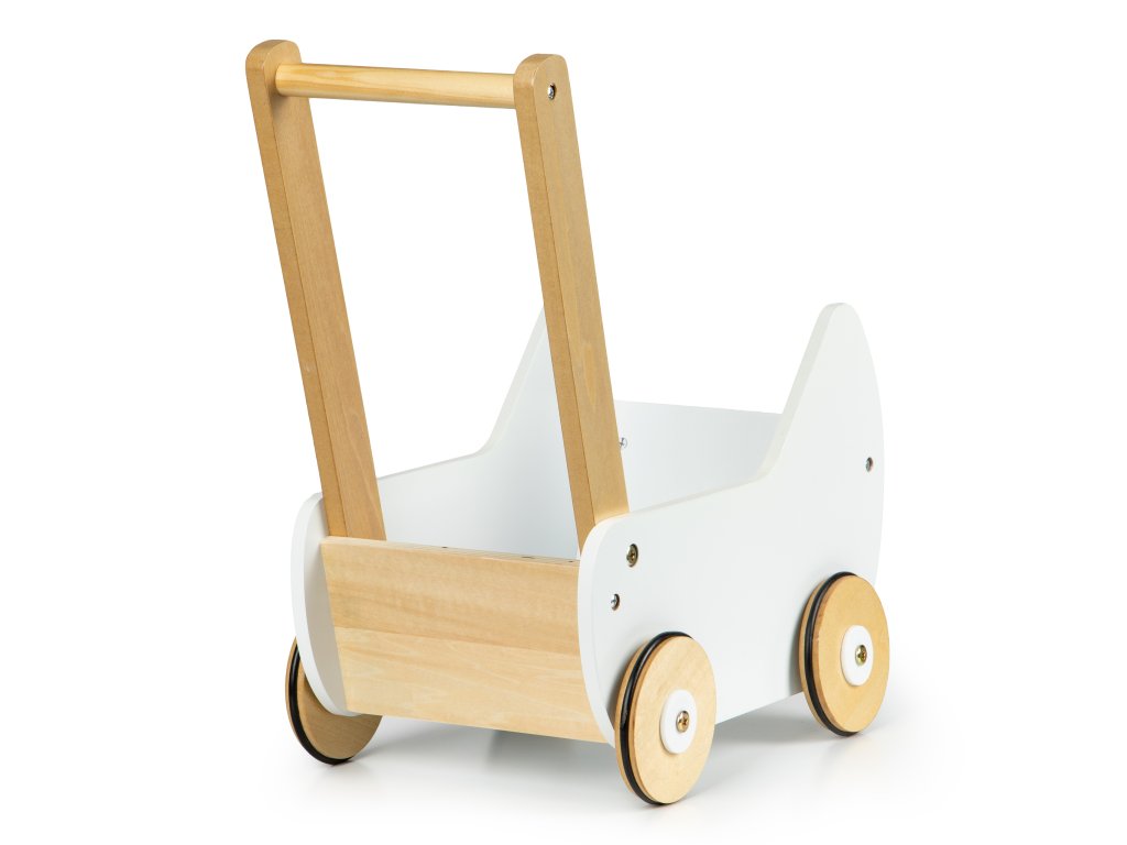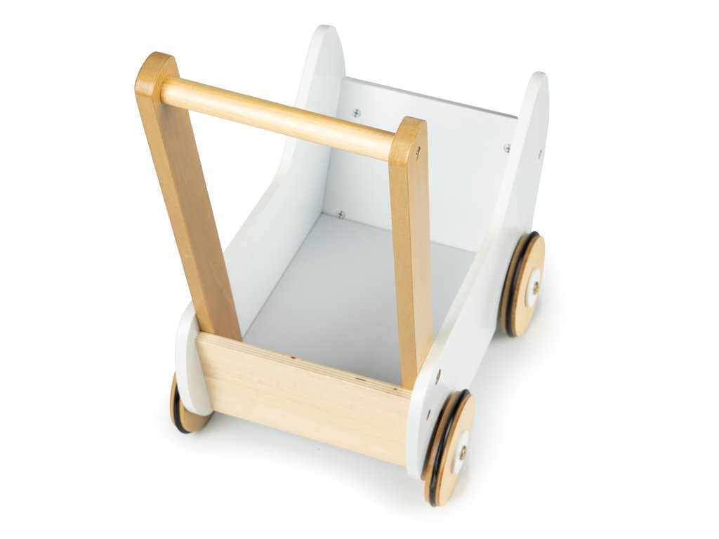 Vozík je vyroben výhradně ze dřeva a natřen barvou bezpečnou pro děti. Stabilní konstrukce bez ostrých hran a nebezpečných prvků takže se nemusíte bát o bezpečnost svého dítěte při hře.