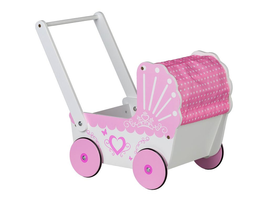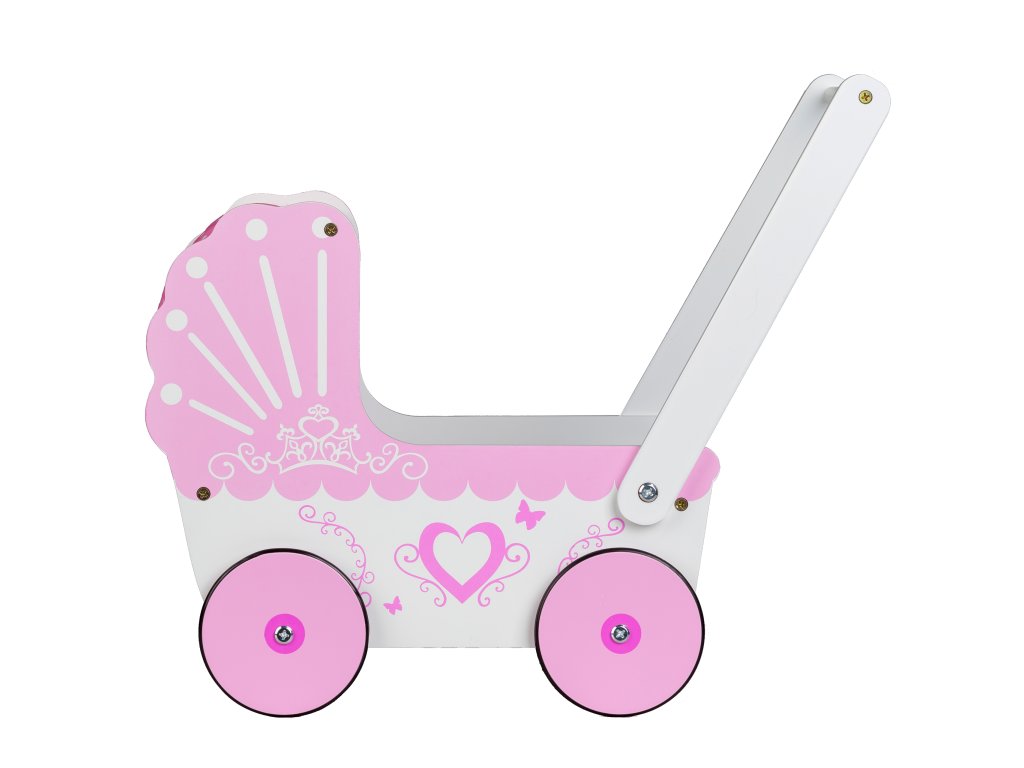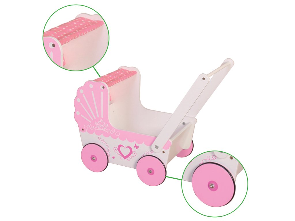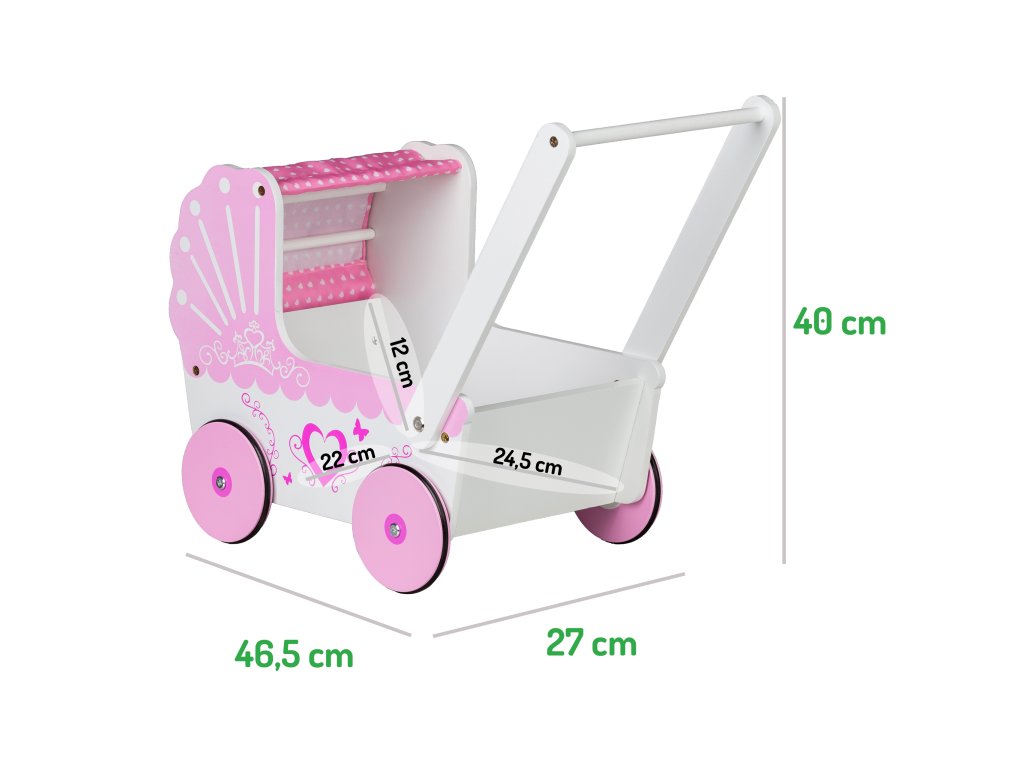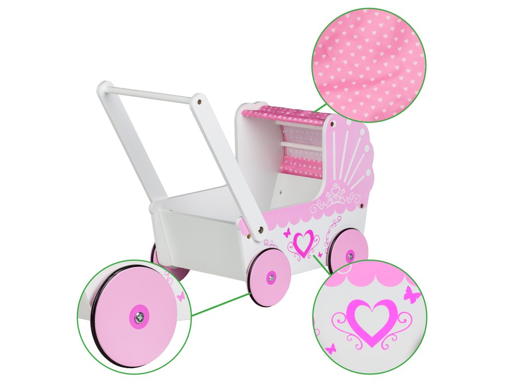 Dřevěný kočárek pro panenky je snem každé holčičky která si užívá roli mladé matky. Od této chvíle bude vaše dítě schopno nosit svou oblíbenou panenku a medvídka ve stylovém růžovém kočárku. Jeho krásný vzhled dokonale zapadá do interiéru pokoje a dodává mu dívčí nádech.