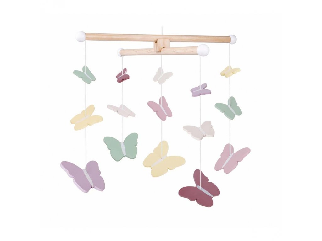 Roztomilý dřevěný mobil s motýly do dětského pokoje. Barevné vzory stimulují smysly a pohyby dítěte. Ideální nad postel nebo přebalovací pult.