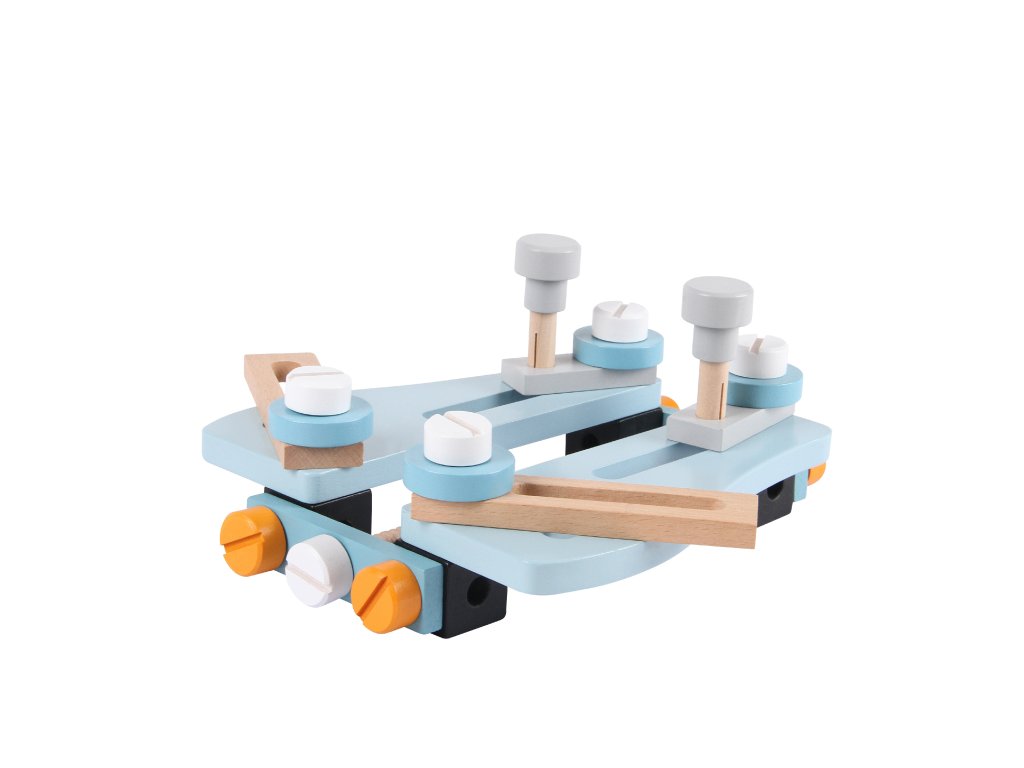 Kromě nástrojů zde najdeme také mnoho šroubů, podložek a dřevěných dílů které lze připojit zkroutit a připojit. Vaše dítě se zabaví na celé hodiny!