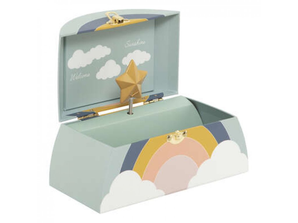 Tato hrací skříňka "Rainbow" je kombinací jemných barev. Když se střecha otevře, spustí se melodie a místnost se ponoří do jemné atmosféry. Hvězda, která se otáčí v rytmu hudby, je zároveň jejím kouzlem.