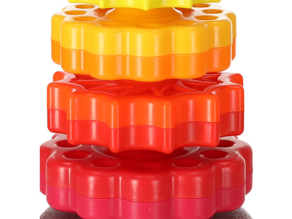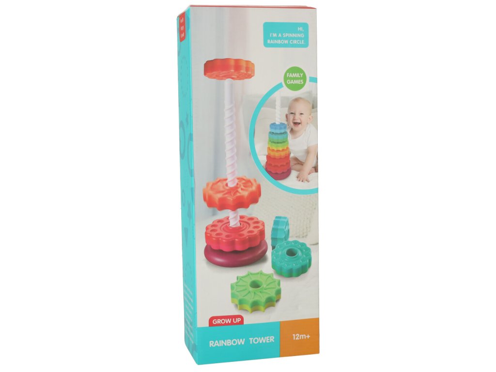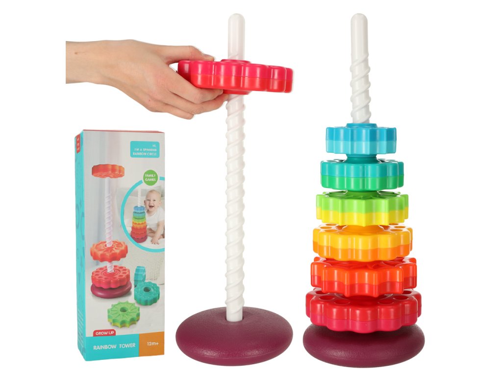 Barevná věž se skládá z osmi kruhů, které jsou v různých barvách a mají různé vyřezávané prvky. Úkolem batolete je umístit všechny kruhy na plastovou tyč, která má navíc zajímavou strukturu!