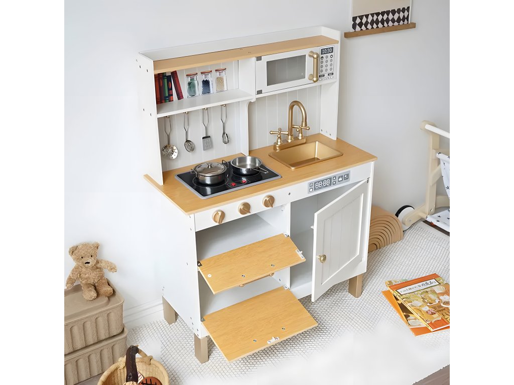 - Otočné knoflíky umístěné pod pracovní deskou vydávají při otáčení zvuk "cvakání". Kuchyňská linka má otevření dveří, díky kterému bude zábava ještě poutavější.