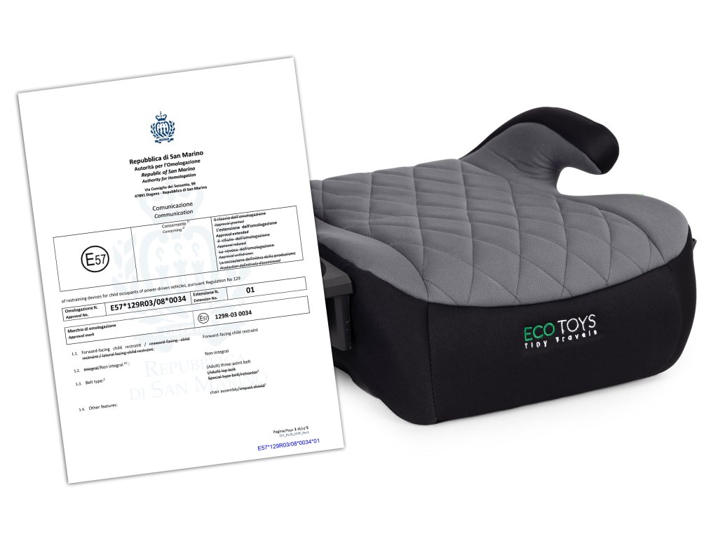 Podložka do auta ECOTOYS splňuje nejnovější evropské bezpečnostní normy v souladu s nařízením i-Size (ECE R129/03). Tato norma byla zavedena s cílem zajistit maximální bezpečnost dětí při cestování autem, ukládá přísné požadavky na výrobce sedadel a podložek. Náš výrobek prošel všemi potřebnými testy včetně crash testů, certifikace i-Size potvrzení dodržování všech bezpečnostních požadavků. To vám dává jistotu, že dítě bylo během cesty dostatečně chráněno.