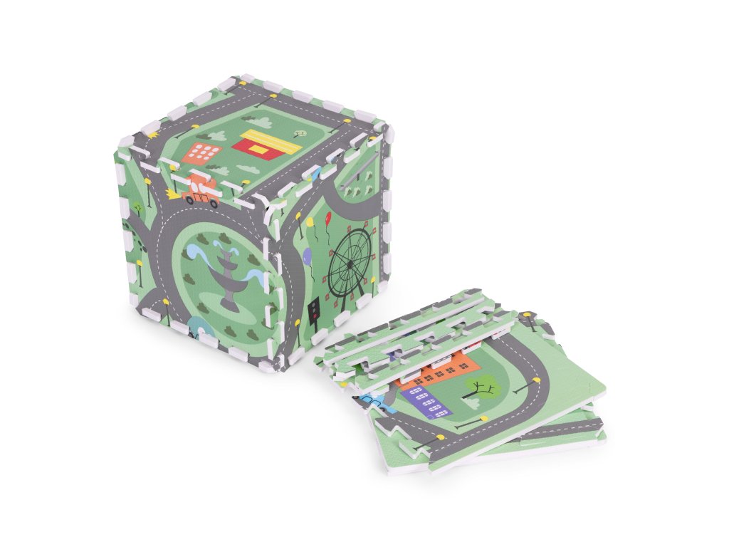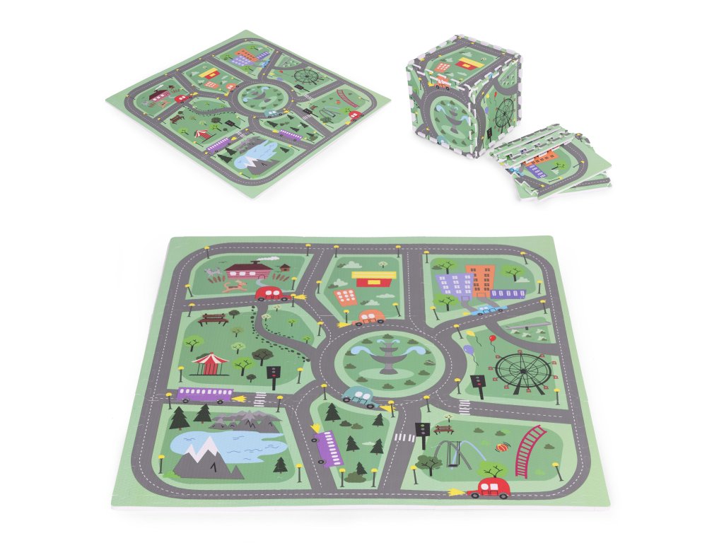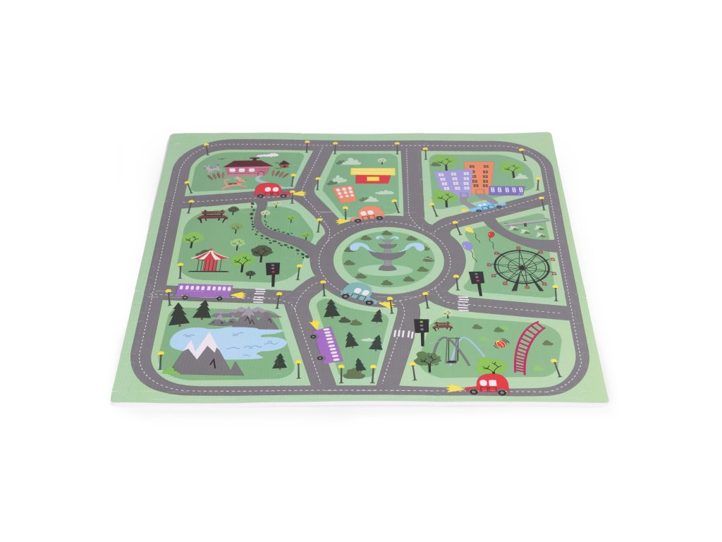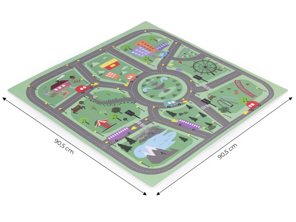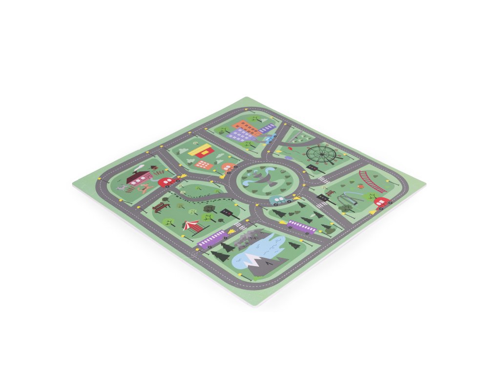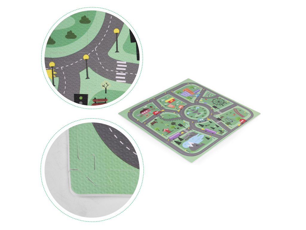 Podložka má jedinečný design zobrazující malebné město s mnoha silnicemi, ulicemi a křižovatkami. Podložka tak nabízí kreativní a vzrušující forma zábavy pro malé fanoušky aut, vozidel a různých dopravních prostředků . Každý prvek na podložce je pečlivě navržen s důrazem na detail, podněcovat dětskou představivost a podporovat je v objevování a interakci s okolím. Díky jasným a zářivým barvám jsou vzory vizuálně přitažlivé, což dále stimuluje smyslový vývoj dítěte.