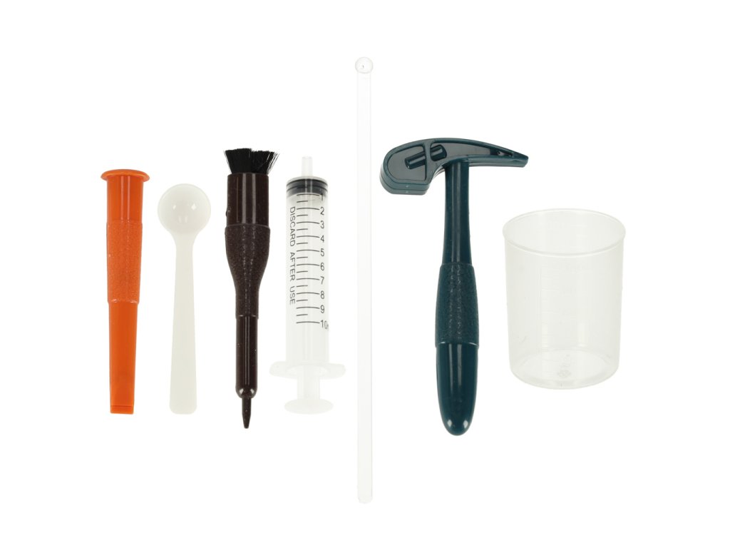 ● sádrový model sopky se skrytými dinosaury a horninovými minerály ● kyselina citronová ● hydrogenuhličitan sodný ● kladivo ● dláta (úzká a široká) ● štětec ● štětka ● stříkačka ● lžíce ● míchadlo ● kelímek ● plakát ● podrobný návod